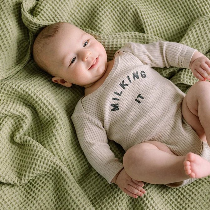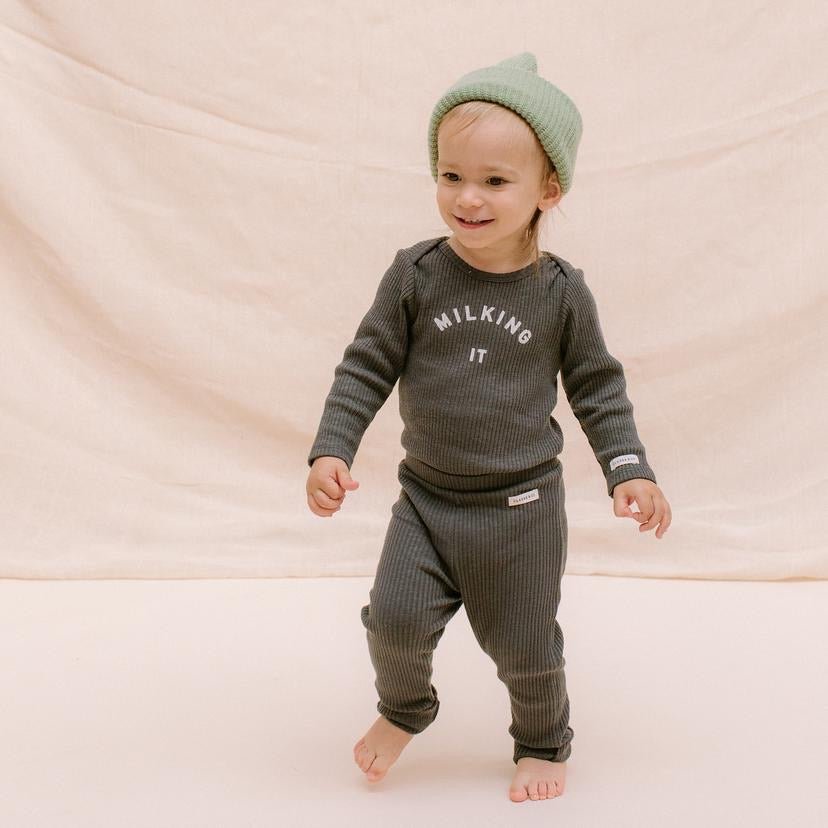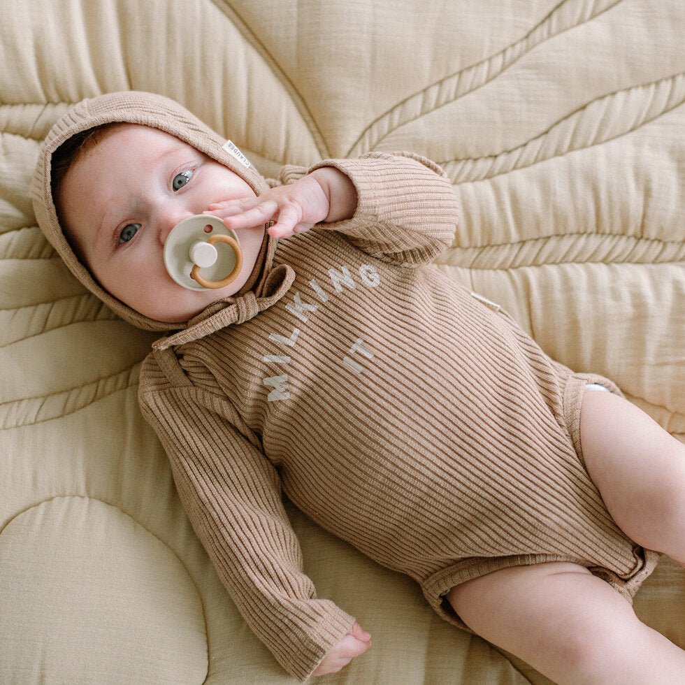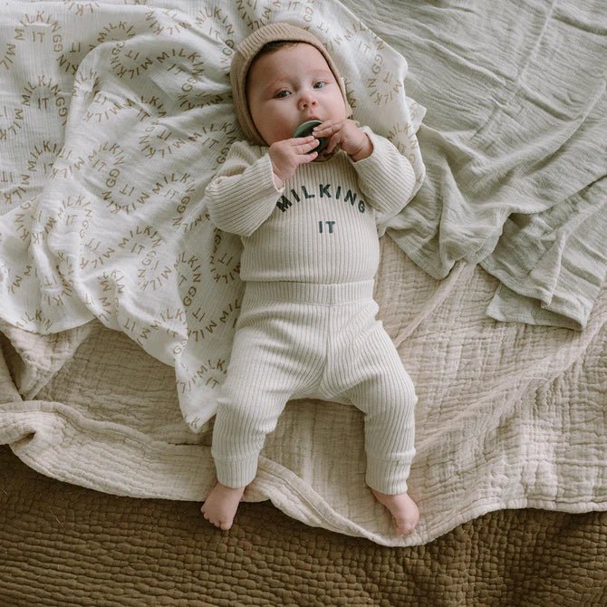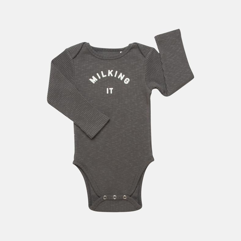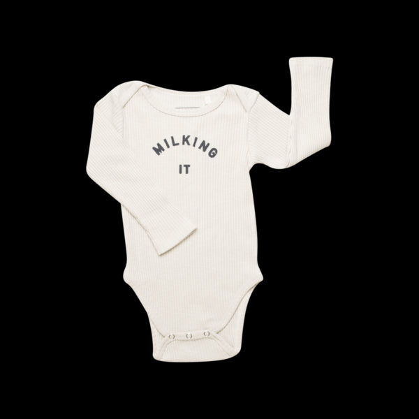 Adorable ribbed bodysuit in organic oat rib cotton with 'MILKING IT' printed across the chest in black text. This beautiful onesie is soft, cosy, and kind against the skin and to the planet. If there's any essential for a little wardrobe...it's this.