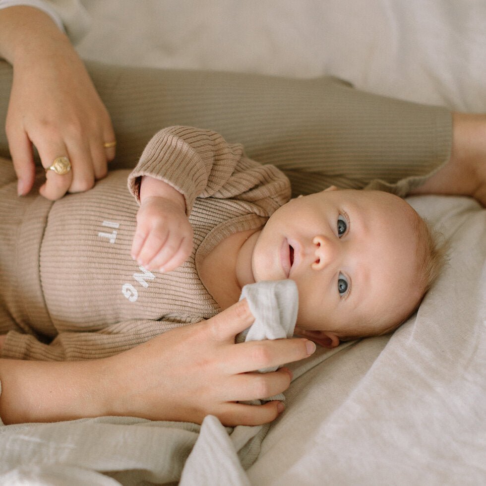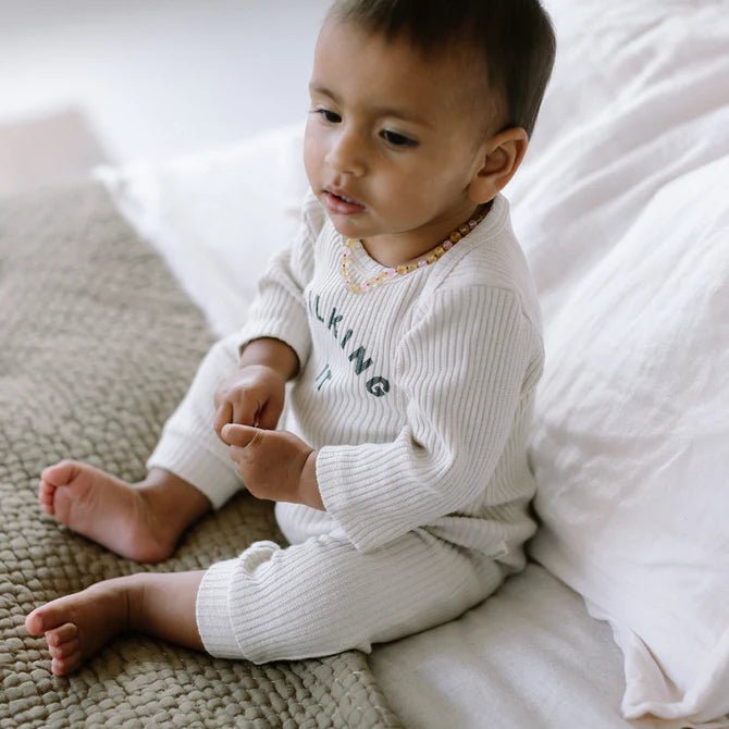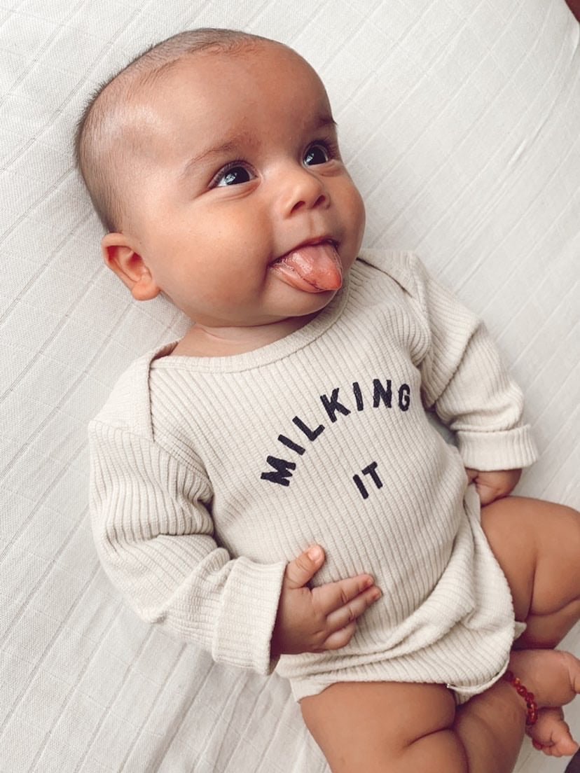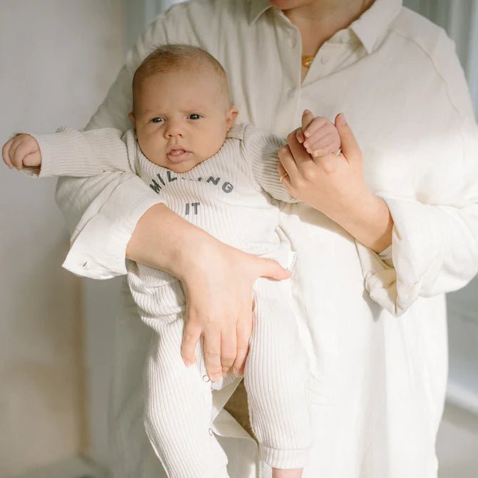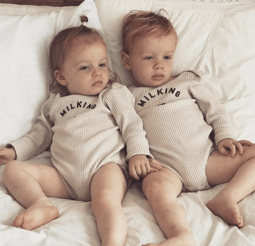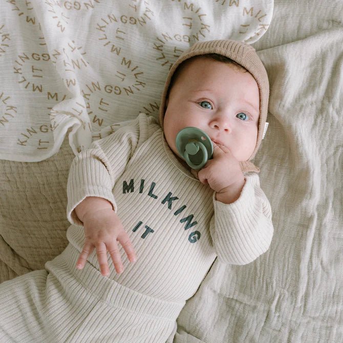 Adorable ribbed bodysuit in organic oat rib cotton with 'MILKING IT' printed across the chest in black text. This beautiful onesie is soft, cosy, and kind against the skin and to the planet. If there's any essential for a little wardrobe...it's this.