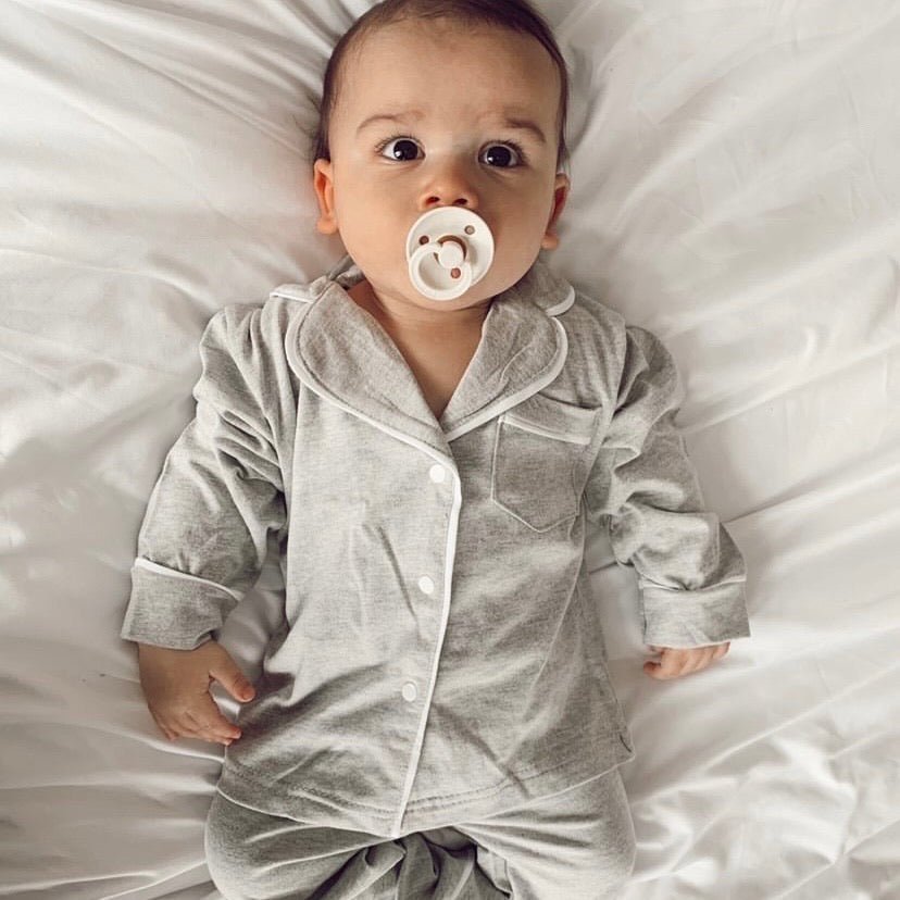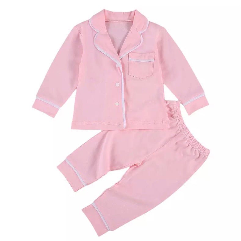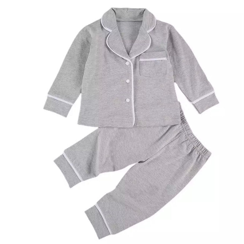 Soft cotton lapel pyjamas available in light Grey or pink with white piping, wrist and ankle cuffs, pocket and button detail.