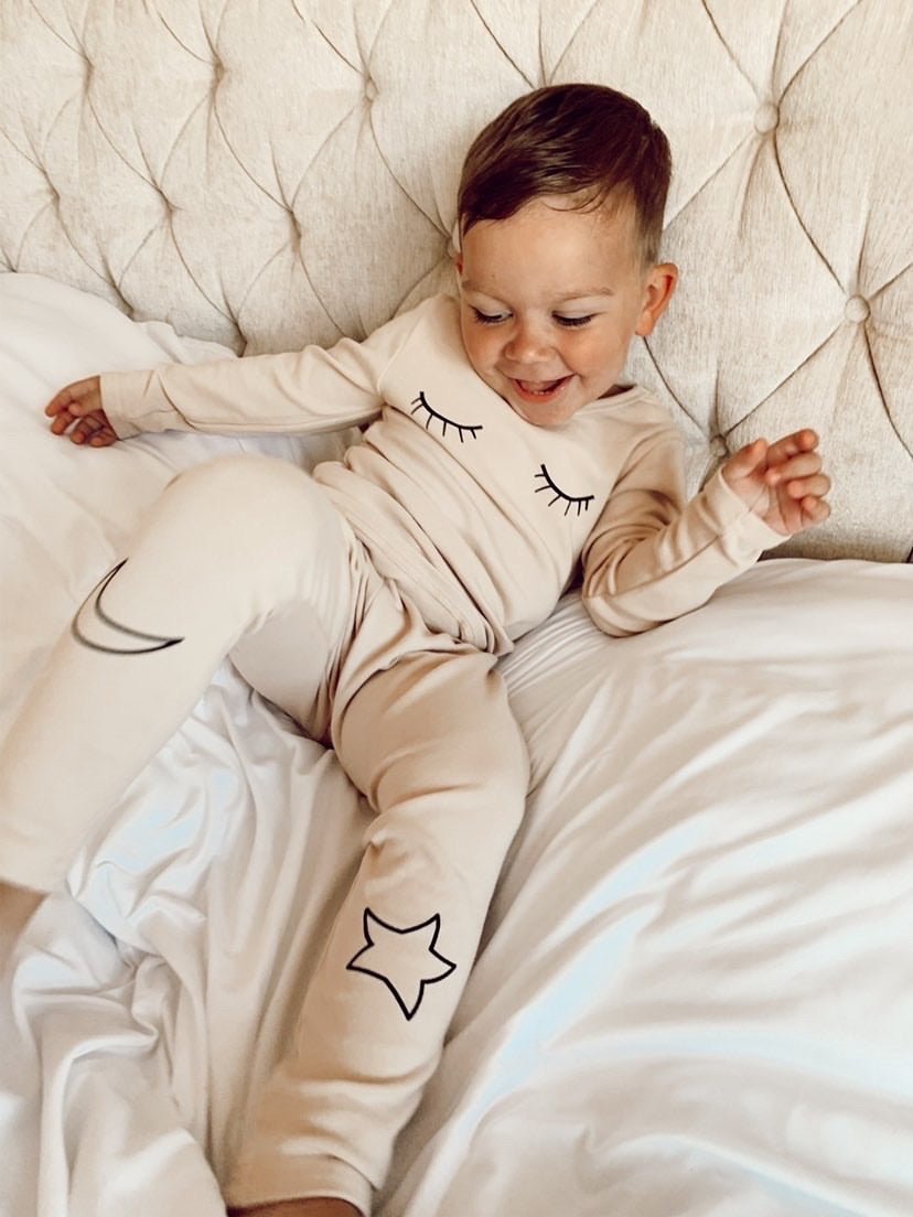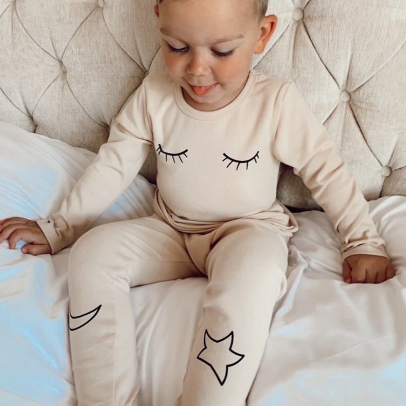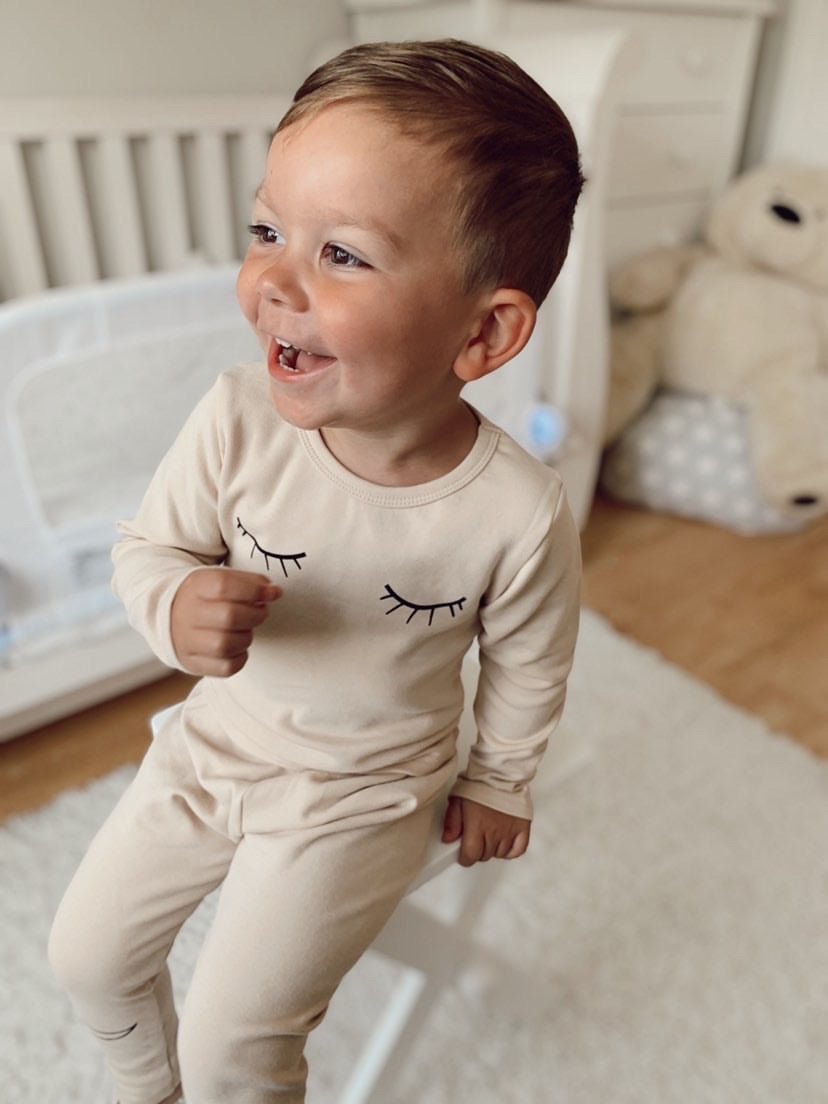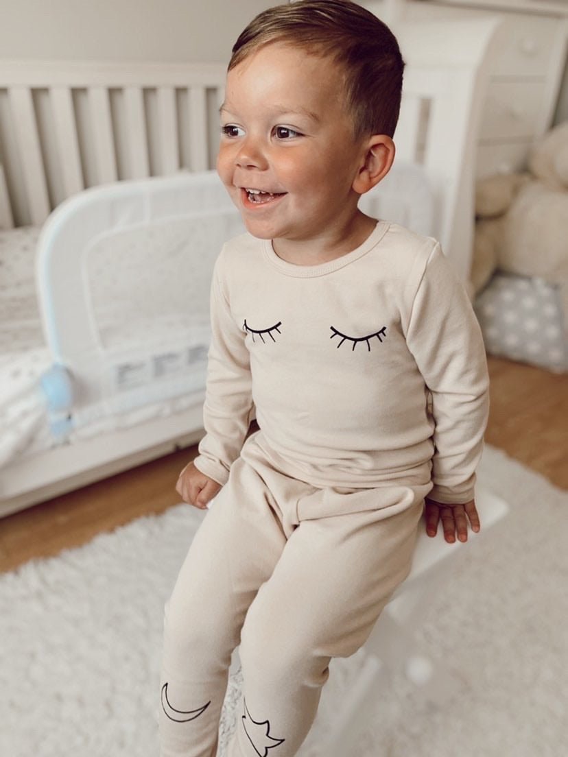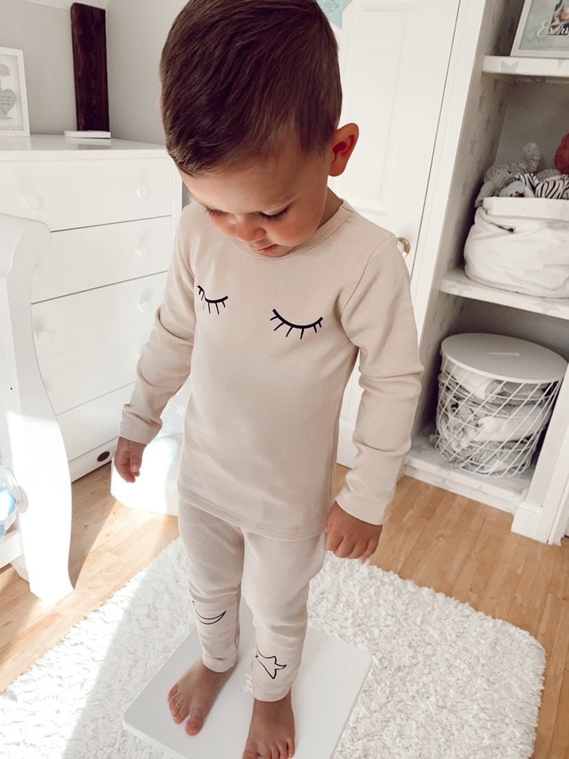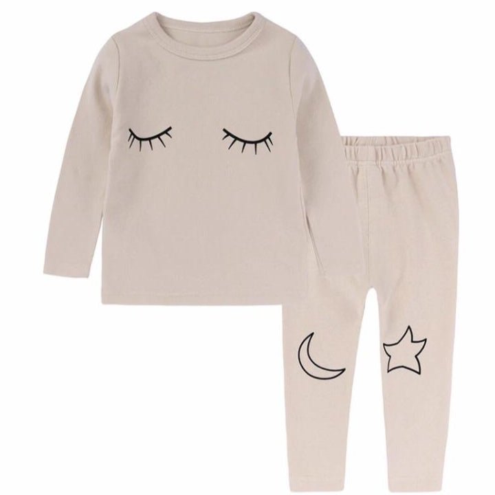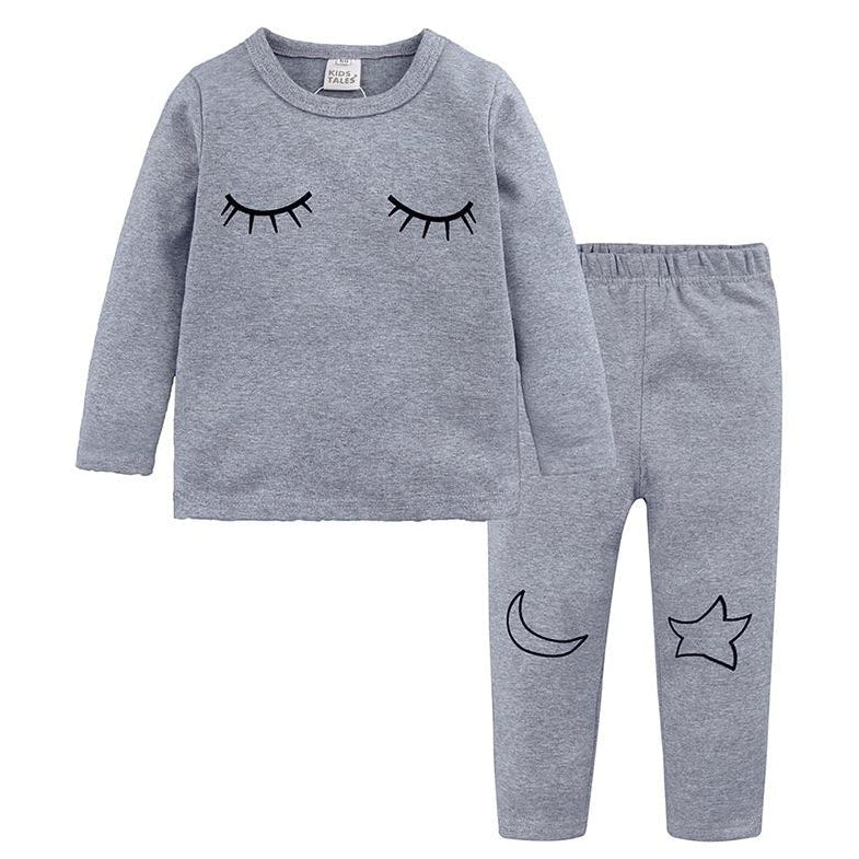 Description: A long sleeve pyjama top printed with cute eyelash design comes with elasticated waist pyjamas bottoms with a star and cloud print