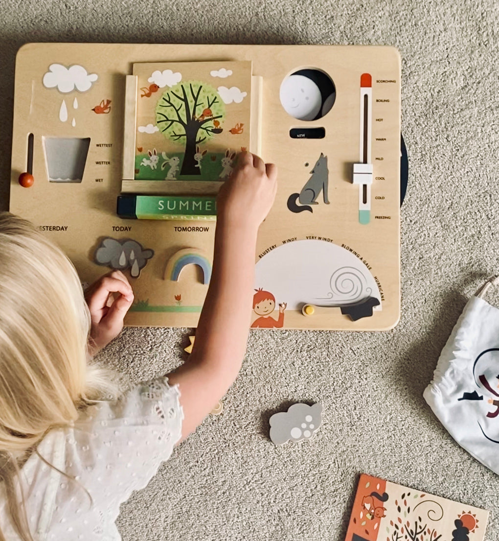 have fun and learn about the weather and the phases of the moon with this high-quality wooden weather station. Turn a wheel to see the 8 phases of the moon and their names, move the temperature band to see the temperature rise and fall, lift the hat of the little boy to show how windy it is, and move the lever up and down the bucket to show how high the rainfall is.