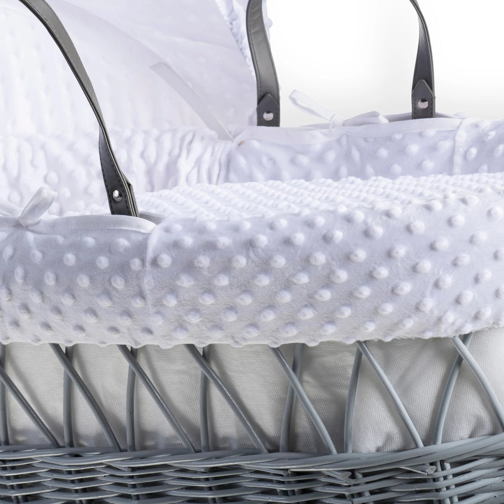 Introducing our Dimple Wicker Moses Basket, a symbol of comfort, elegance, and safety. This sturdy and lightweight wicker basket, dressed with super-soft plush dot Dimple fabric, creates a snug and inviting sleep space.