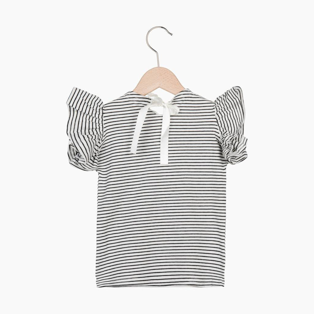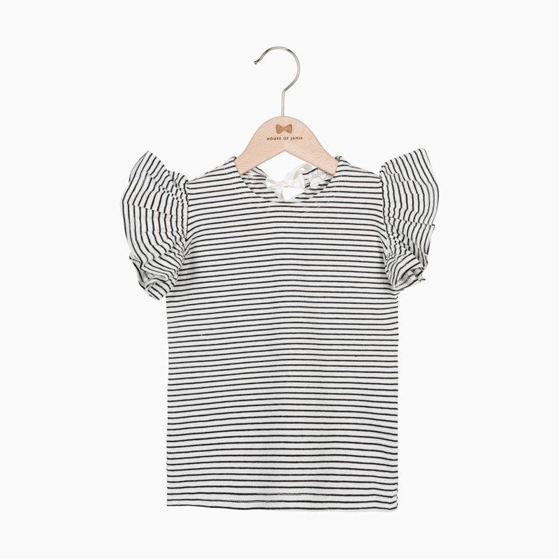 The perfect girls tee! A delicate shirt made of eco-friendly single jersey with playful ruffles as sleeves and satin cords at the back.