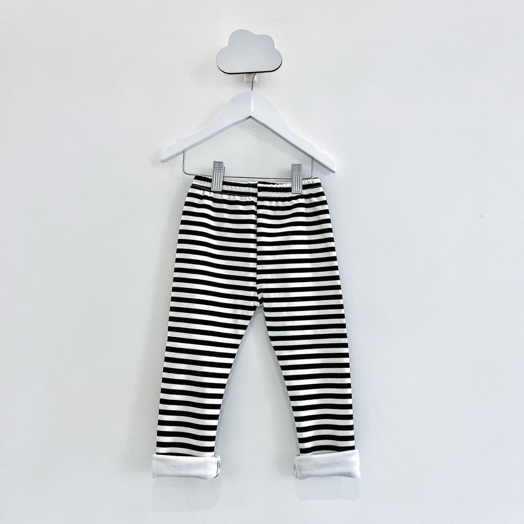 Description: A unisex, black and white striped legging with a delicate fleecy lining and elasticated waist. Made from 95% cotton and 5% elastine.