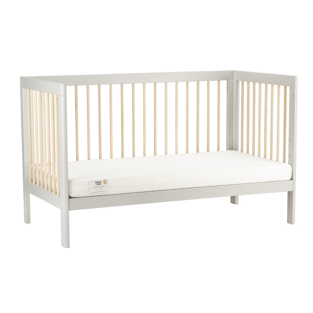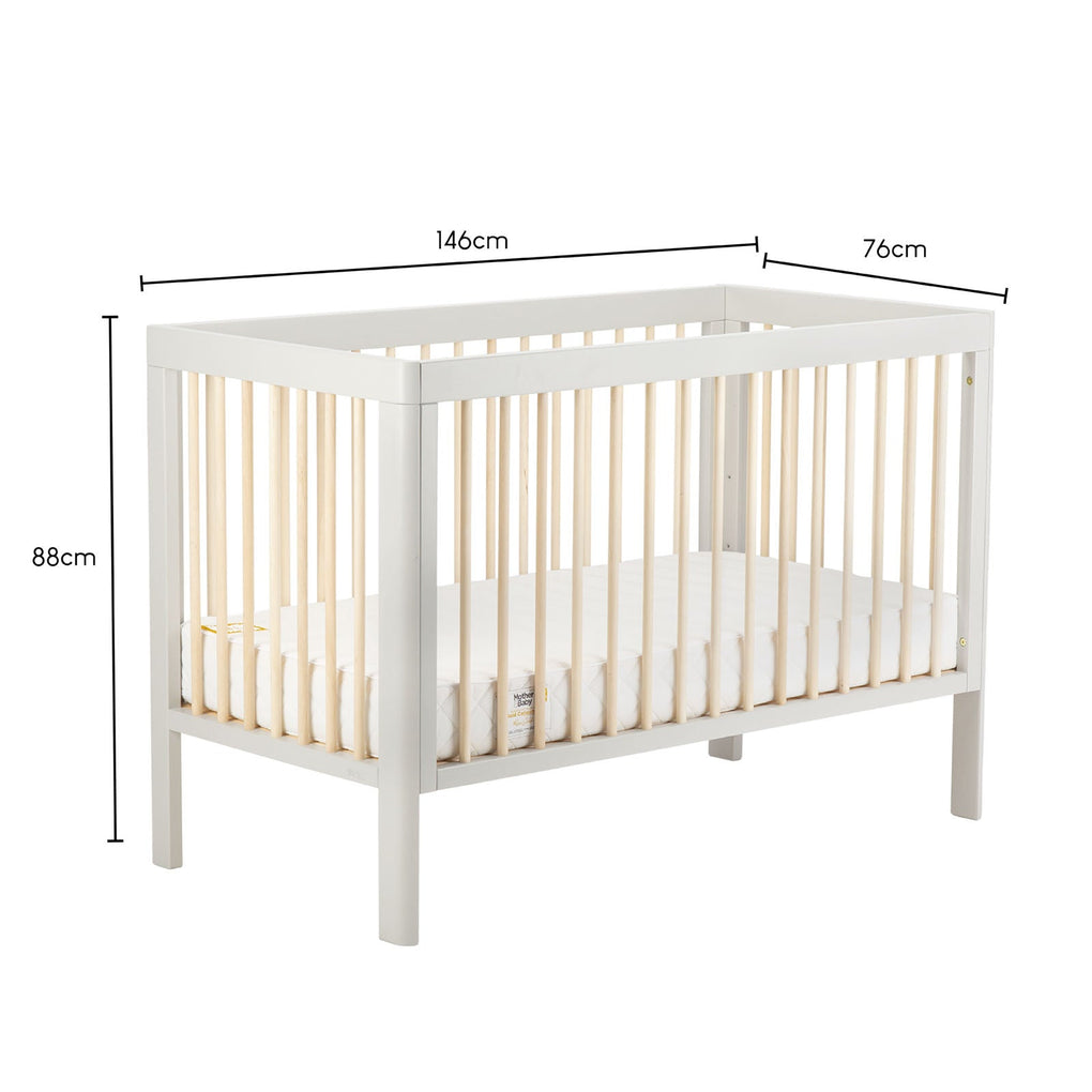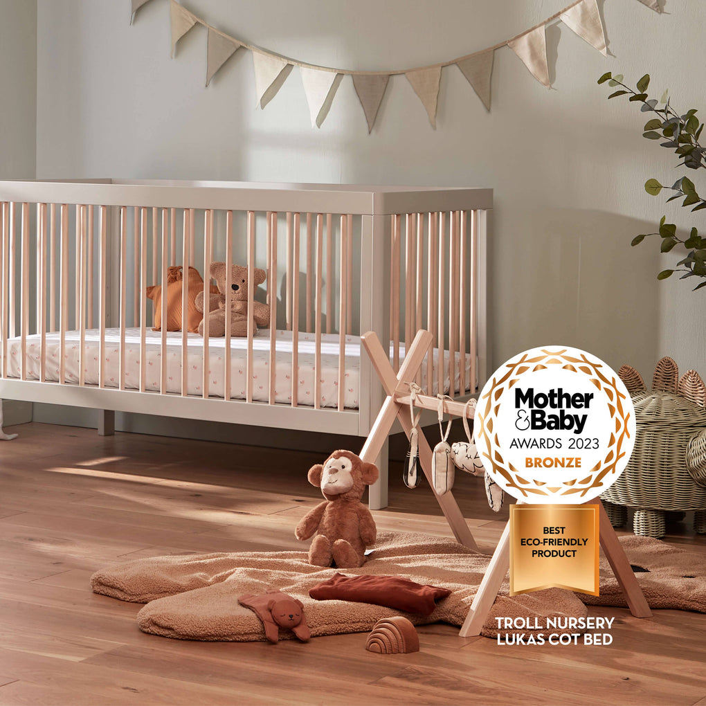 The Lukas Cot Bed from Troll Nursery shows beautiful balance with its subtly curved corners and delicate spindles. The simple colour palette of soft grey with natural birch timber gives any nursery a contemporary look.