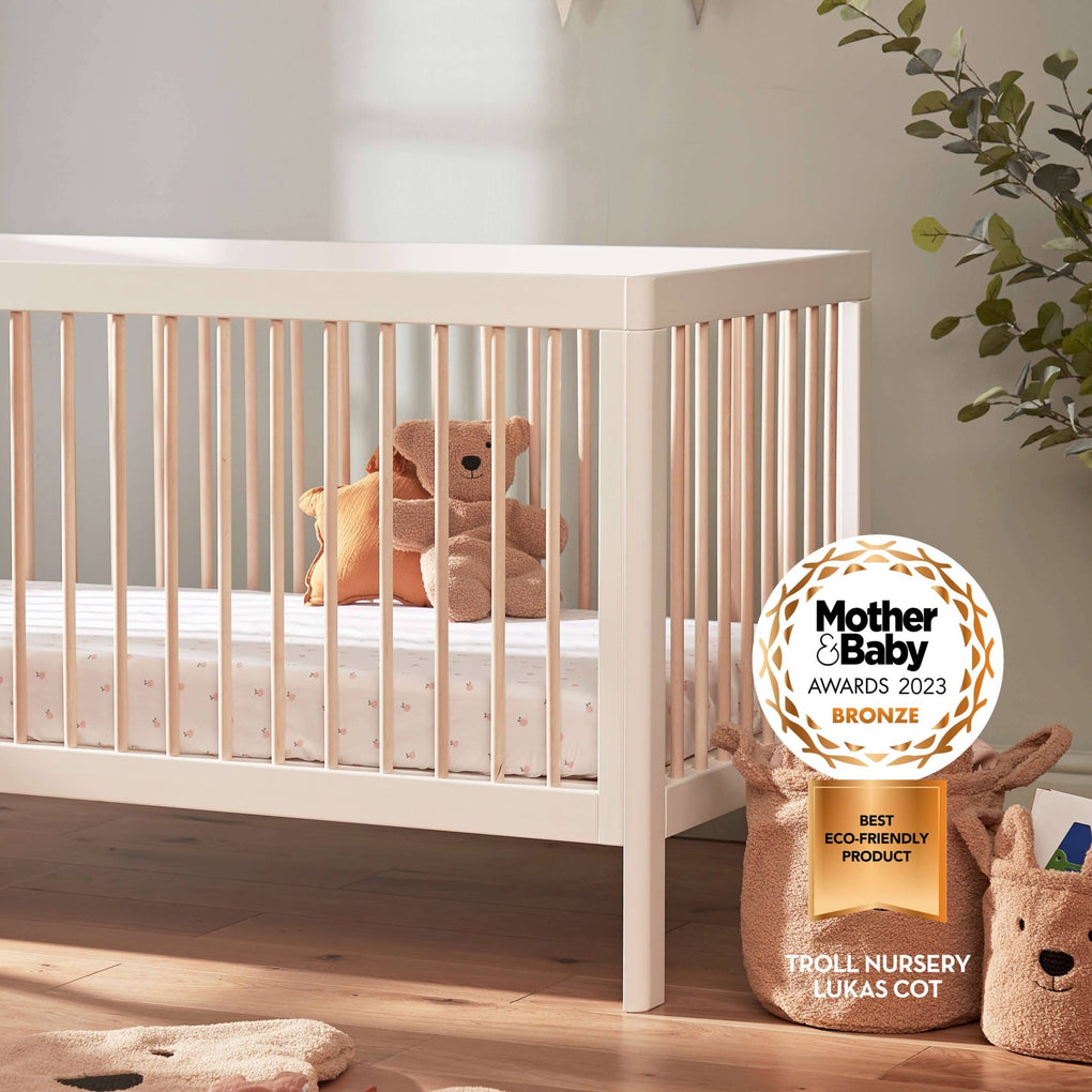The Lukas cot is part of our cots and cot beds range. This Troll Lukas Cot is a beautiful example of Scandinavian design for your nursery, it’s subtly curved corners and delicate natural hand waxed spindles offer a beautiful soft modern look to your nursery with a handcrafted finish.