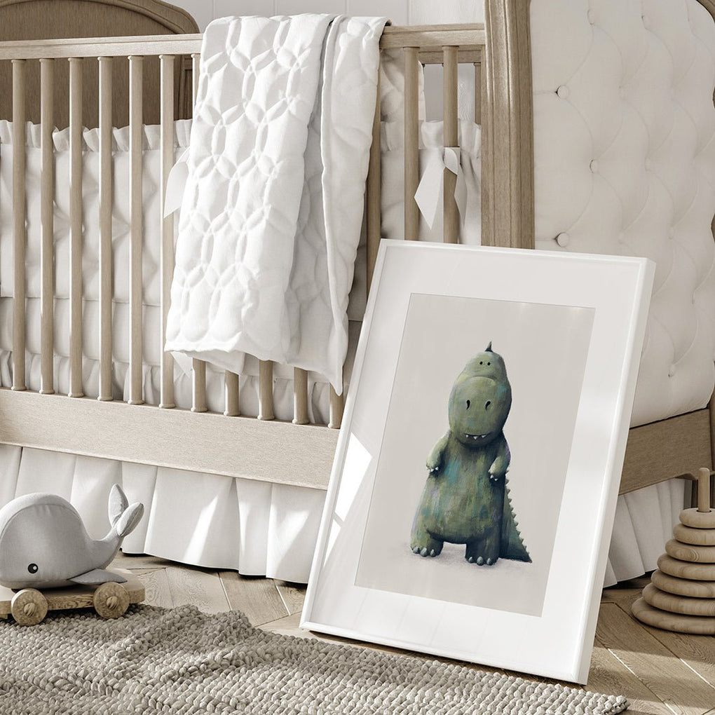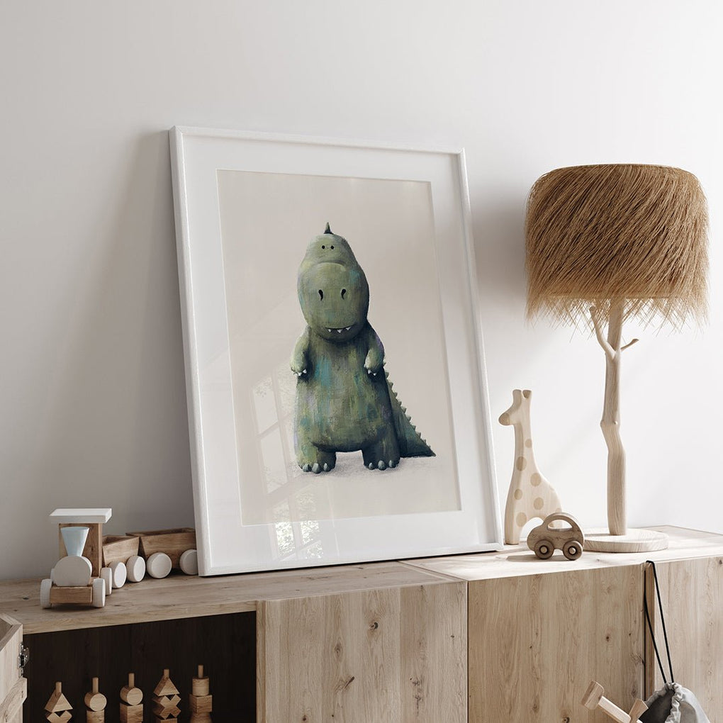 a beautifully illustrated t-rex dinosaur print, perfect for a dino theme baby nursery, children's bedroom or kids playroom.