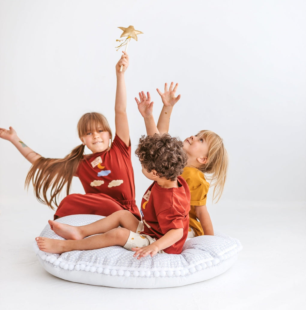 This 40-inch (100 cm) diameter, 6-inch (15 cm) height floor cushion is crafted from 100% OEKO-TEX certified cotton. Handmade in Lithuania by a family business. Suitable from 3 years.