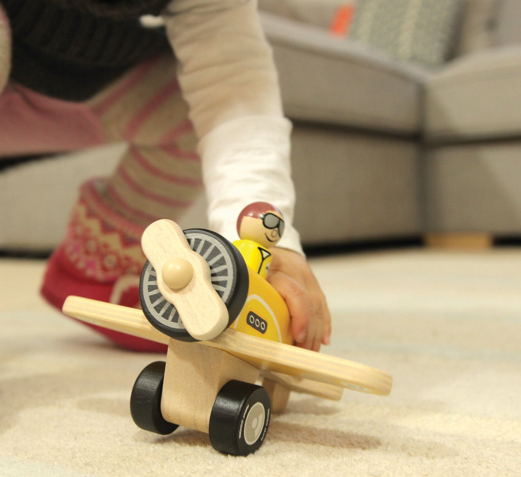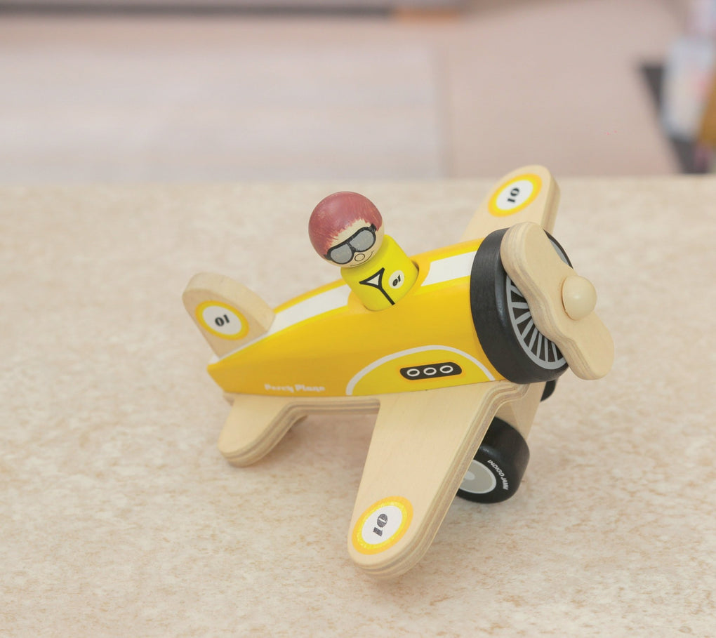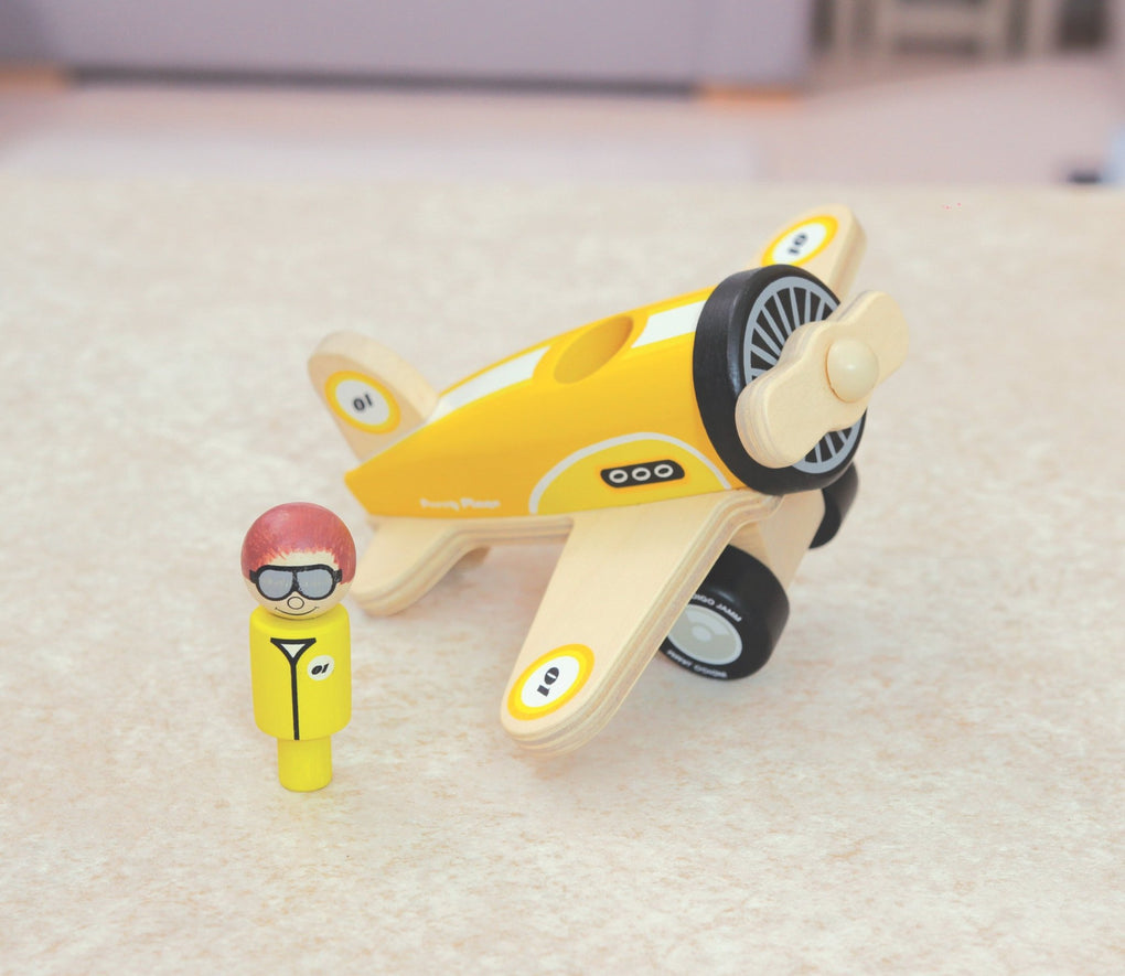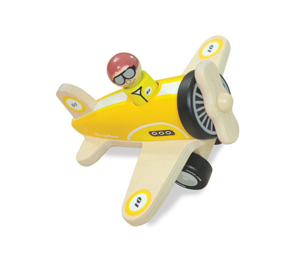 A single seat plane that comes complete with a removable peg pilot and a propeller that can be spun. this durable plane with attractive paintwork is made from sustainable rubberwood.