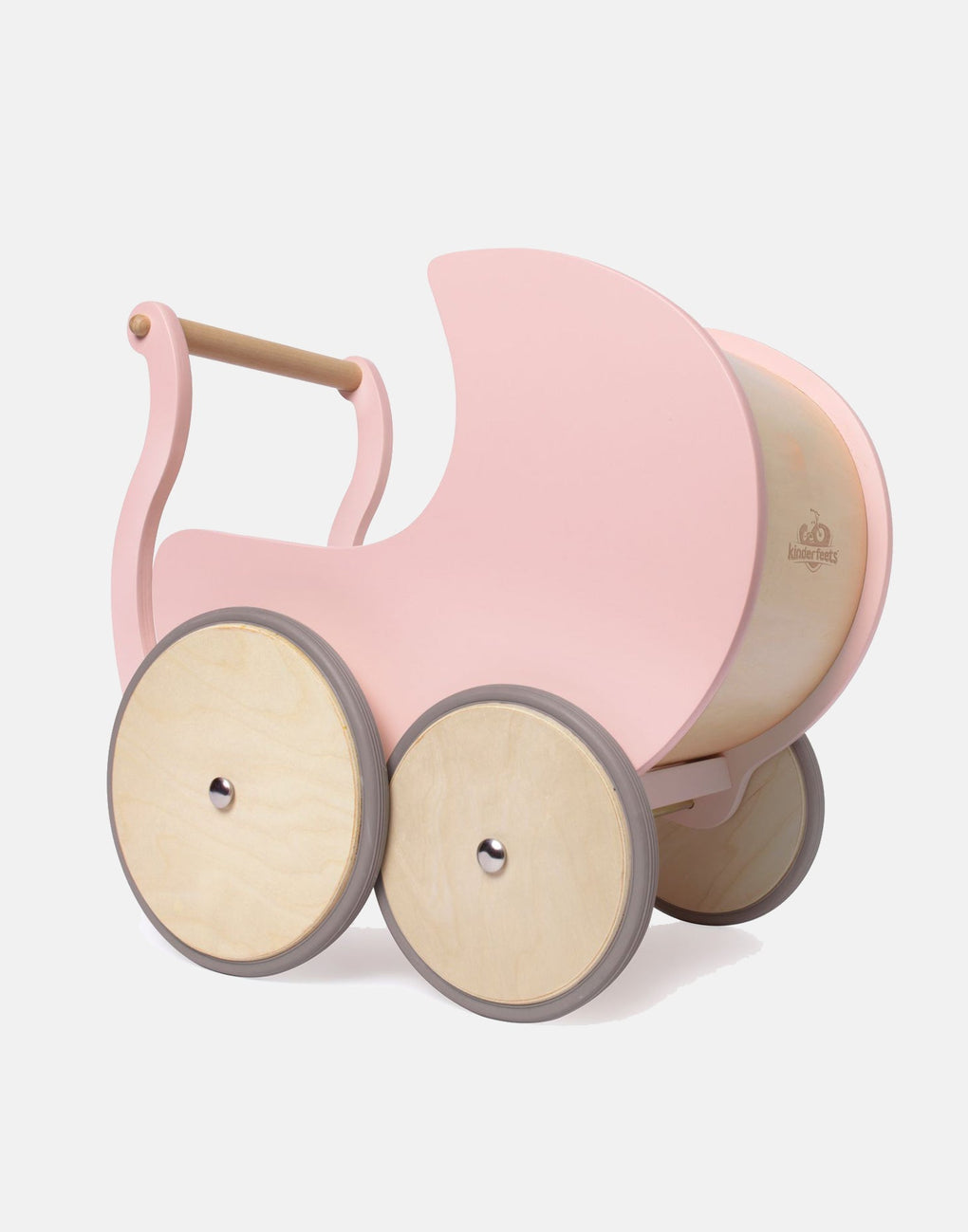 handmade with replenishable birch wood, fitted with large wheels that have rubber trim to prevent scratches and sitting at a handlebar height of 17 inches (35 centimeters), the kinderfeets pram 2-in-1 walker is a unique option for newly active children.