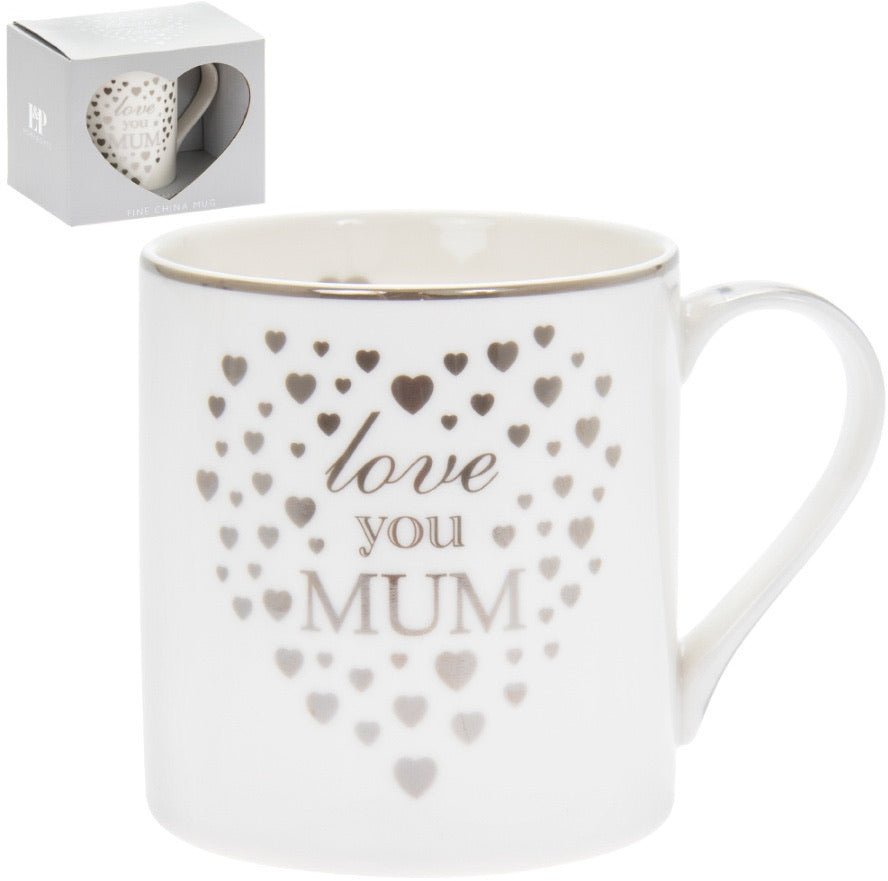 A beautiful white ceramic mug with silver detailing and the text ‘Love You Mum’