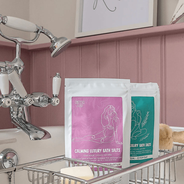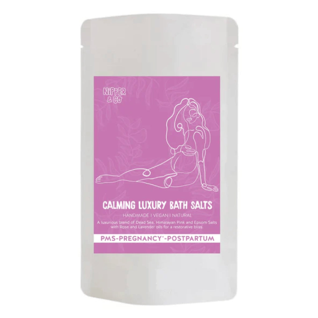 relaxing luxury bath salts for pms, pregnancy and postpartum. Handmade from natural, vegan products.
