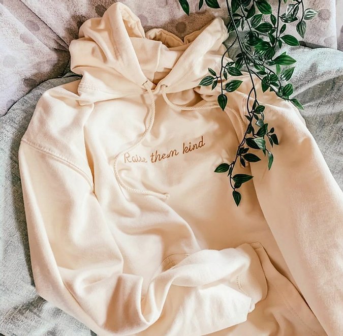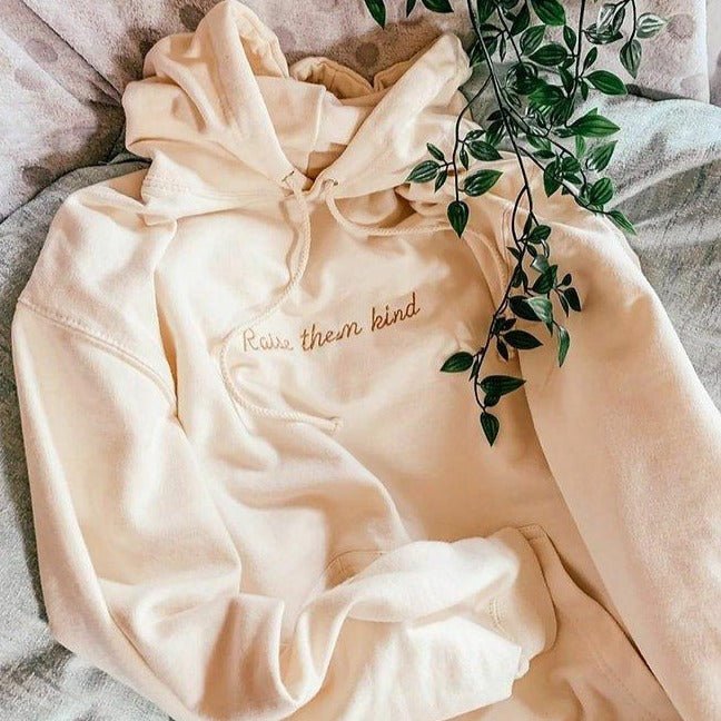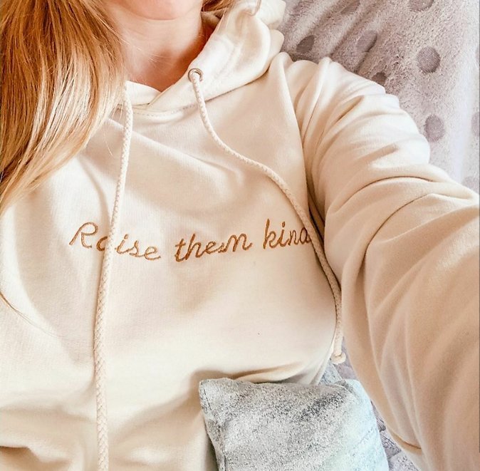 Beautiful soft oversized hoodie in vanilla by Harrbo with Raise them Kind embroidery detail in colour rose gold thread.