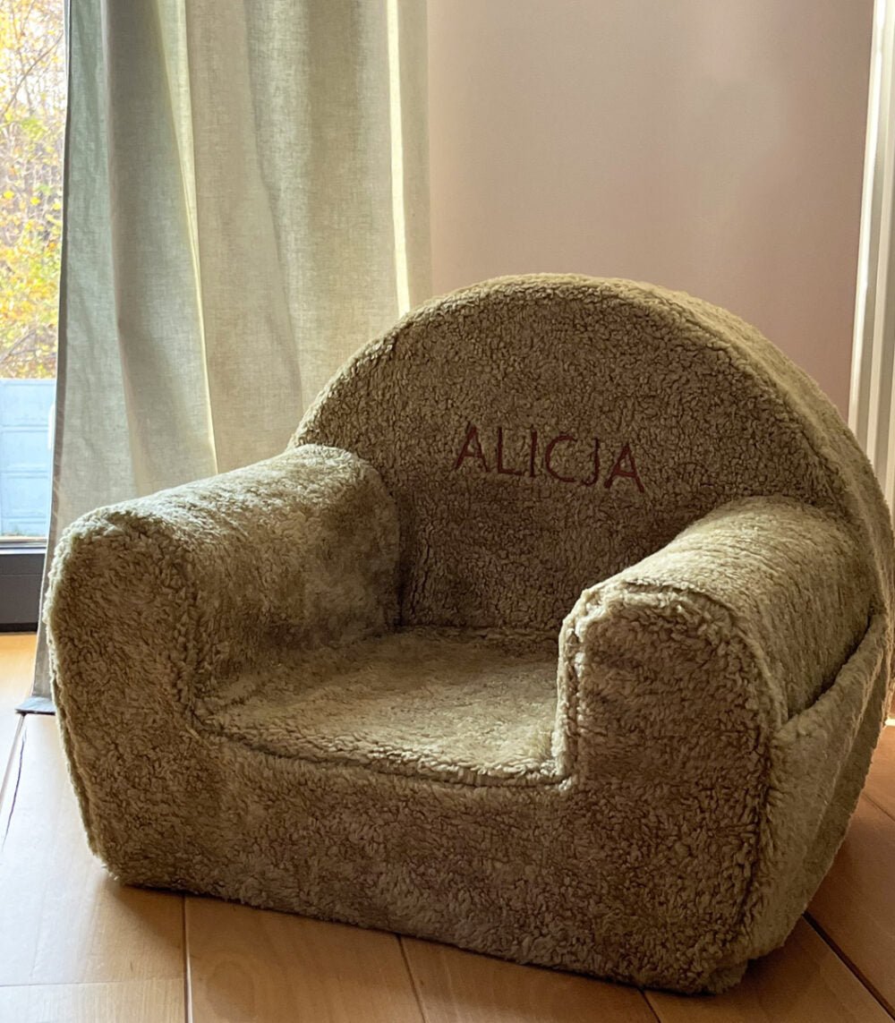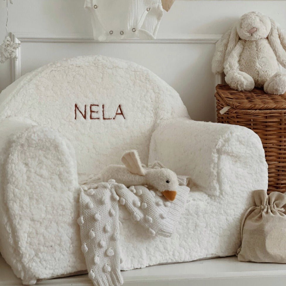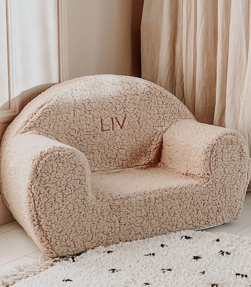 The most beautiful toddler armchair in boucle fur fabric handmade to order and personalised with their name. Makes the perfect special gift.
