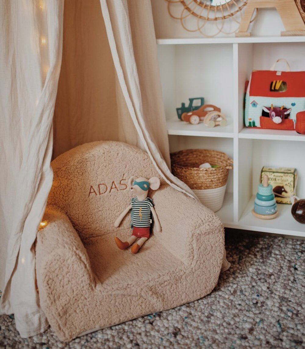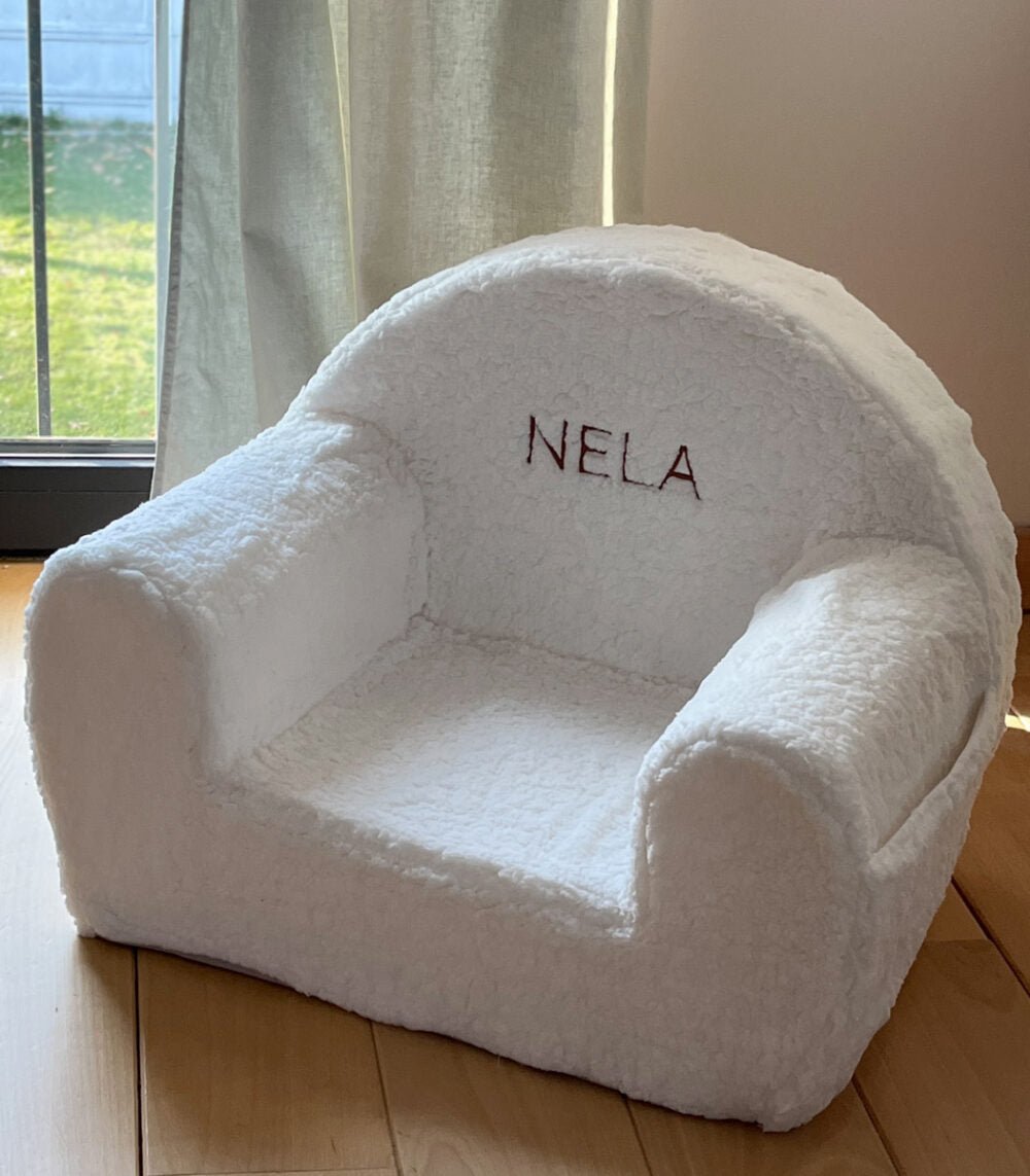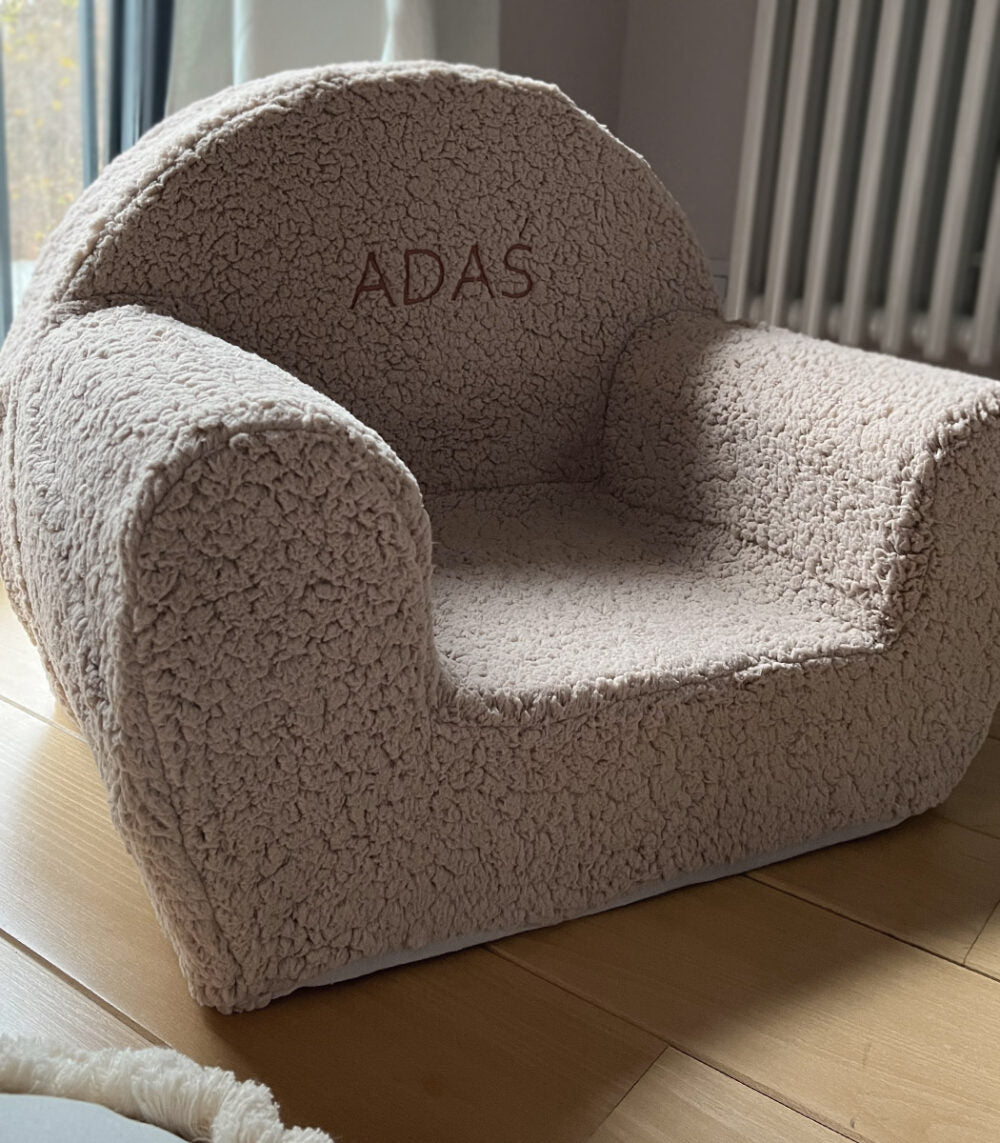 The most beautiful toddler armchair in boucle fur fabric handmade to order and personalised with their name. Makes the perfect special gift.