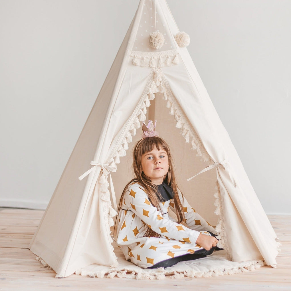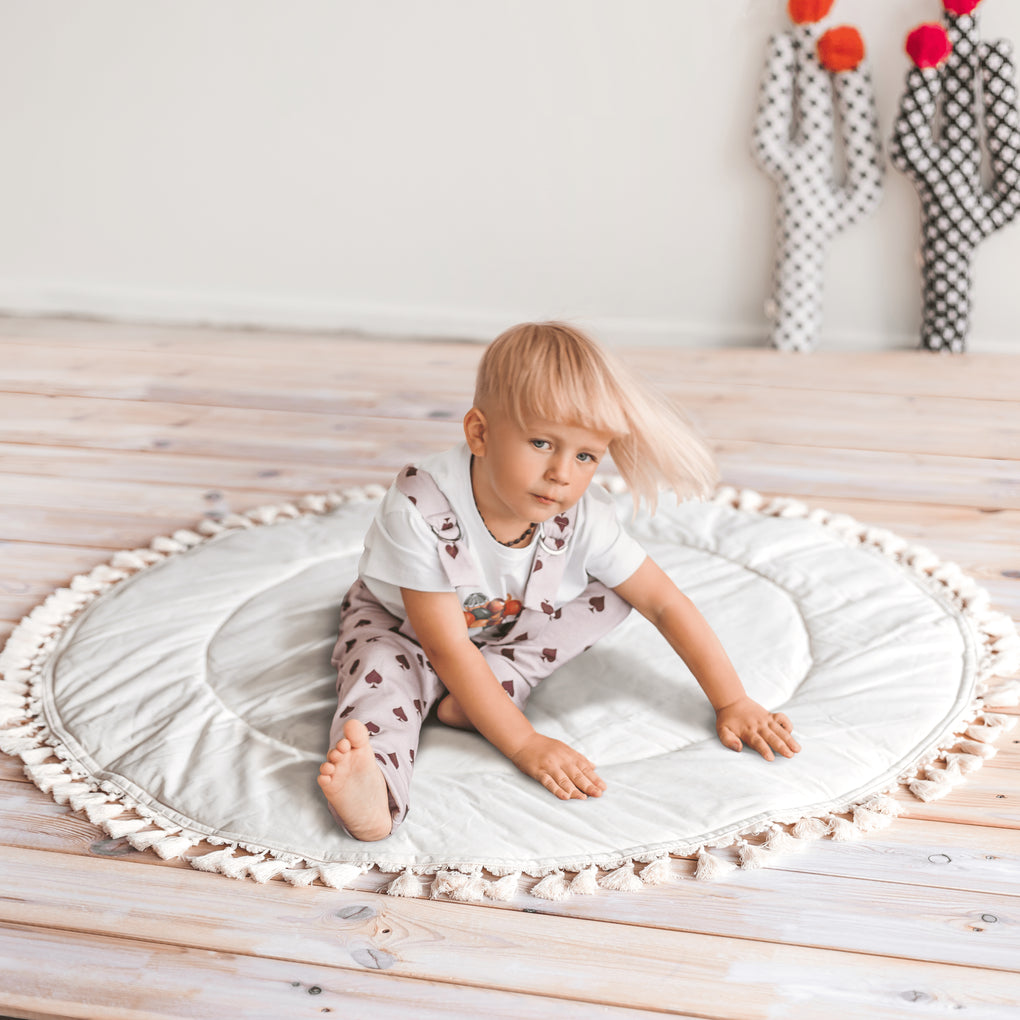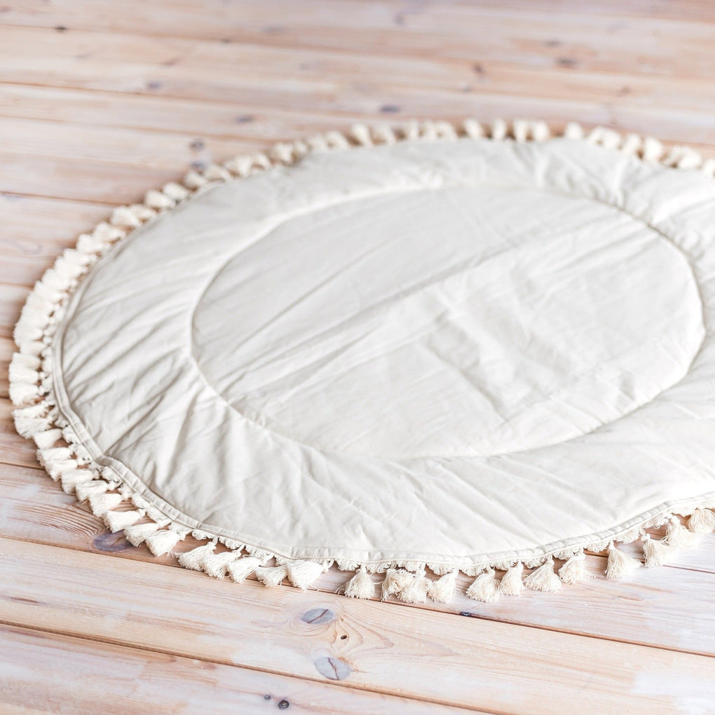 Create a cozy and stylish play space with the MINICAMP Padded Kids Play Mat in Ecru. Featuring a playful tassel border, this handcrafted floor mat for children combines modern charm with everyday comfort, making it a delightful addition to any nursery or playroom.
