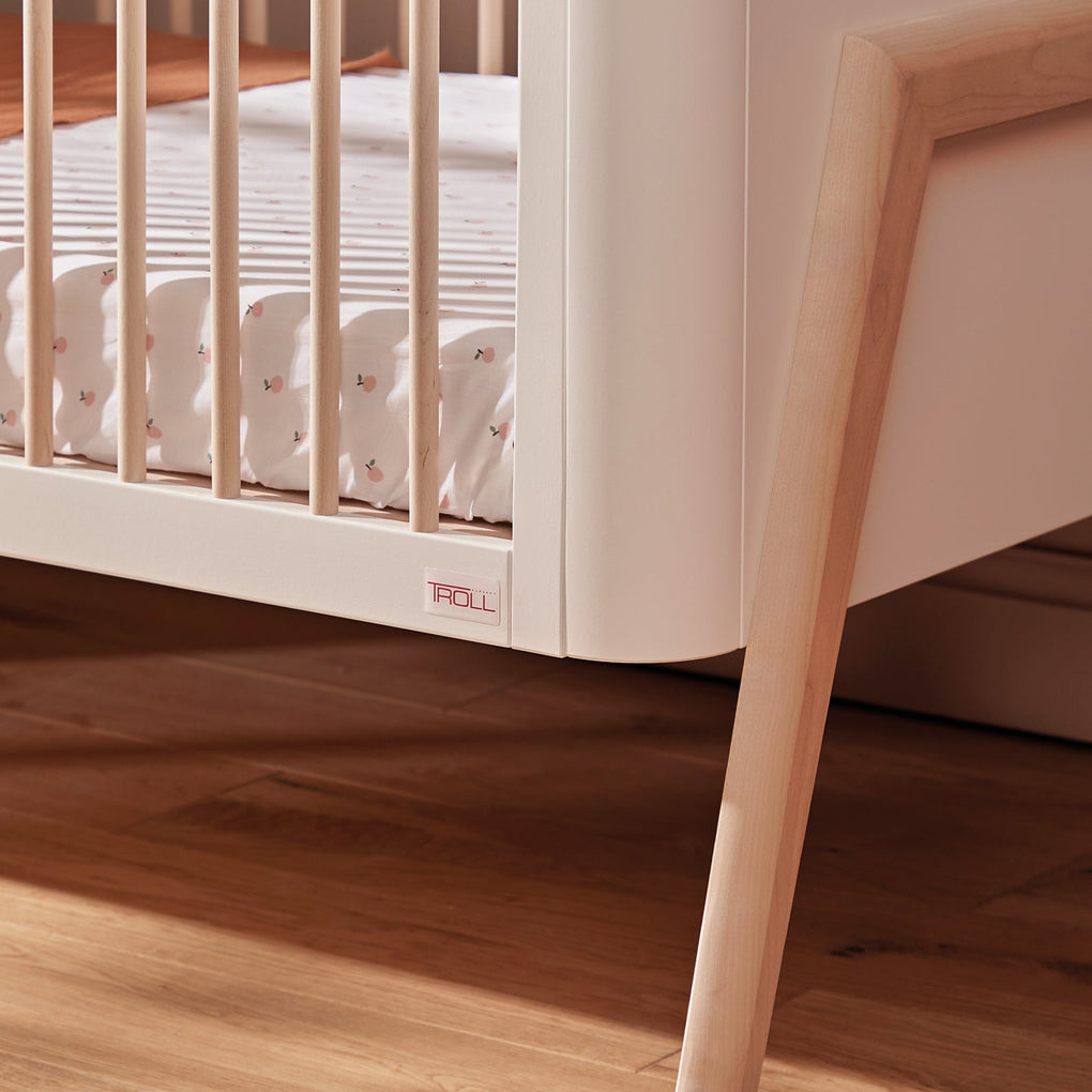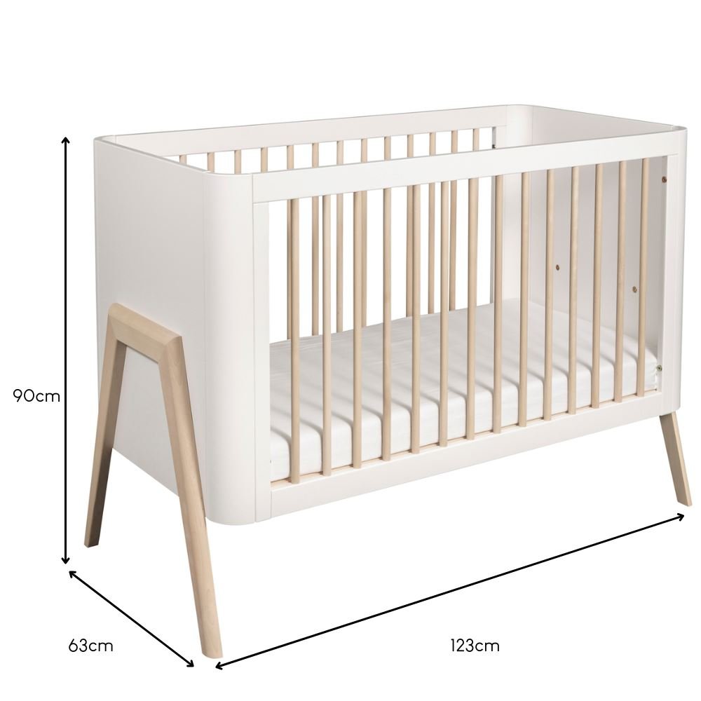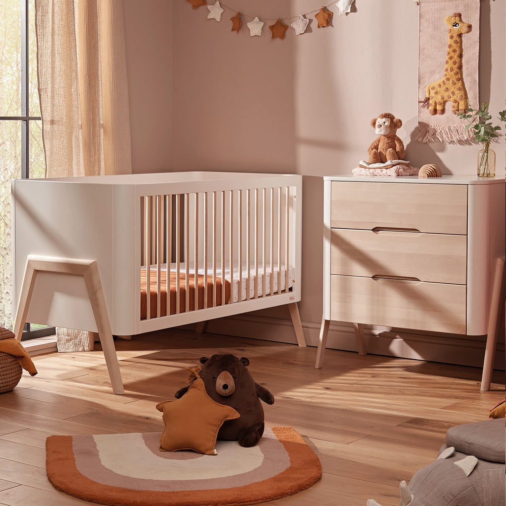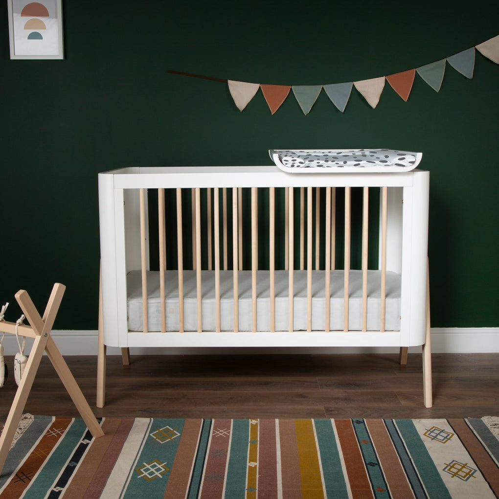 The cot showcases softly curved edges with a contrasting natural wood feature, delicately finished by hand with a natural coloured wax to give your nursery that beautiful modern look you’ve been waiting for.