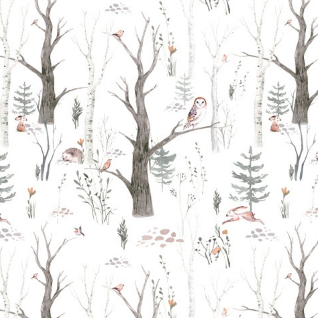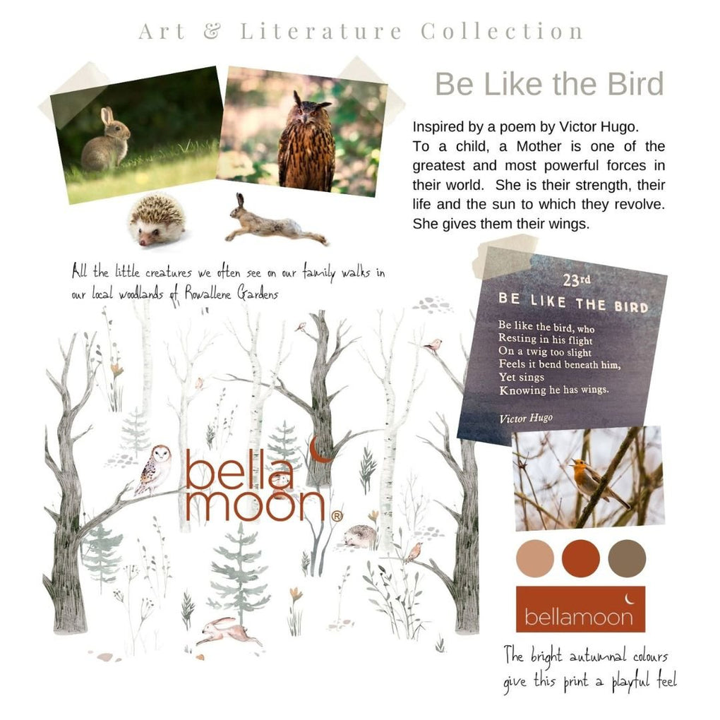 be like the bird is part of our art & literature collection. The design is inspired by nature, set on a soft white backdrop with warm tones of browns and greys throughout the trees and animal motifs.
