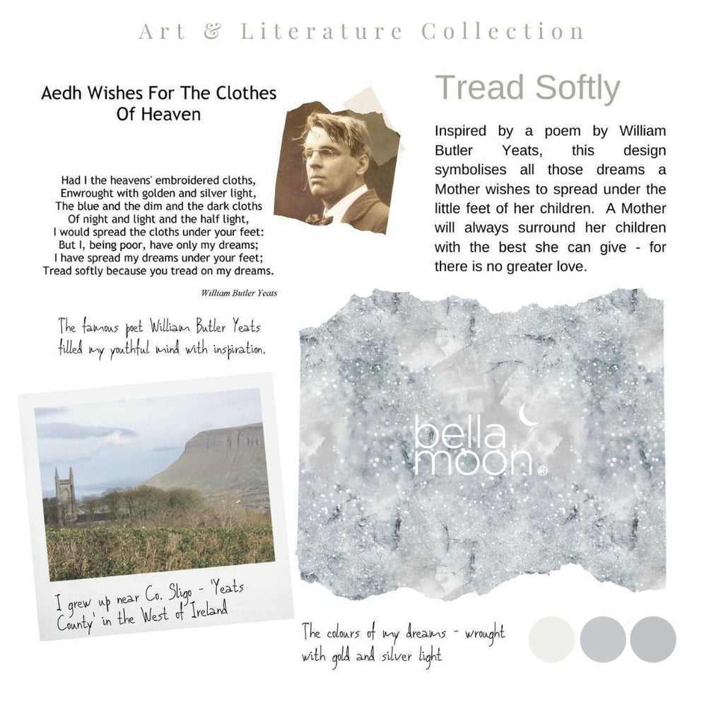 tread softly is part of our art & literature collection. Inspired by the poetry of w. B yeats, its warm grey/blue cloud pallet with white gold speckles throughout represents your dreams.