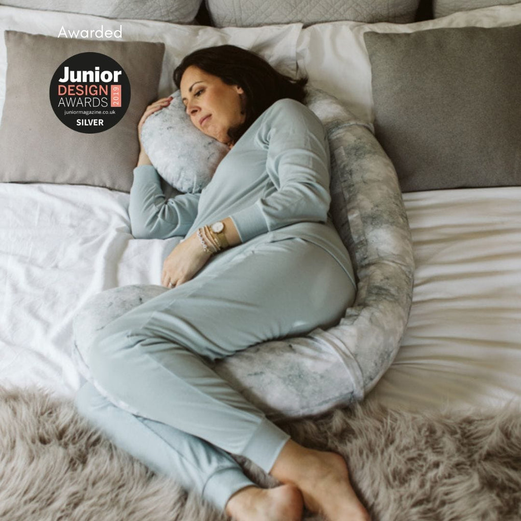 our c-shaped pillow measures 1. 4m in length and is designed to elevate your limbs, to separate your hips and allow your body to adopt a neutral sleeping position during pregnancy.