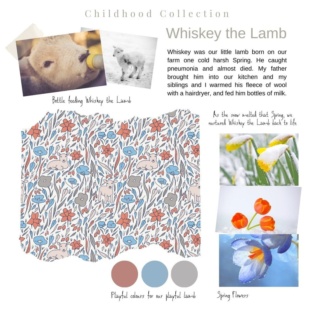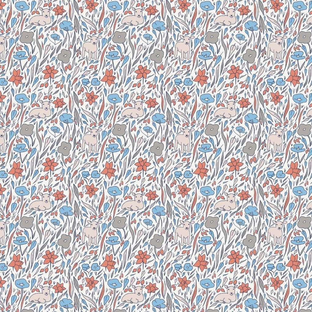 whiskey the lamb is part of our childhood collection. This pattern is inspired by the flowers and lambs of springtime with blue and orange tones.