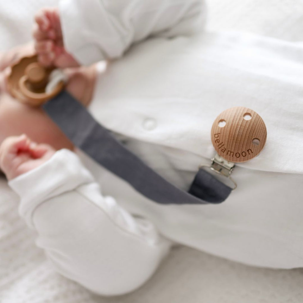 introducing our dummy clips, an essential addition to your daily life with a baby. They are designed to keep your baby's favourite dummy close by at all times. With convenience in mind, simply attach their dummy to the loop and the wooden clip to your little one's clothing. This is the solution to preventing the frustration of misplaced soothers.