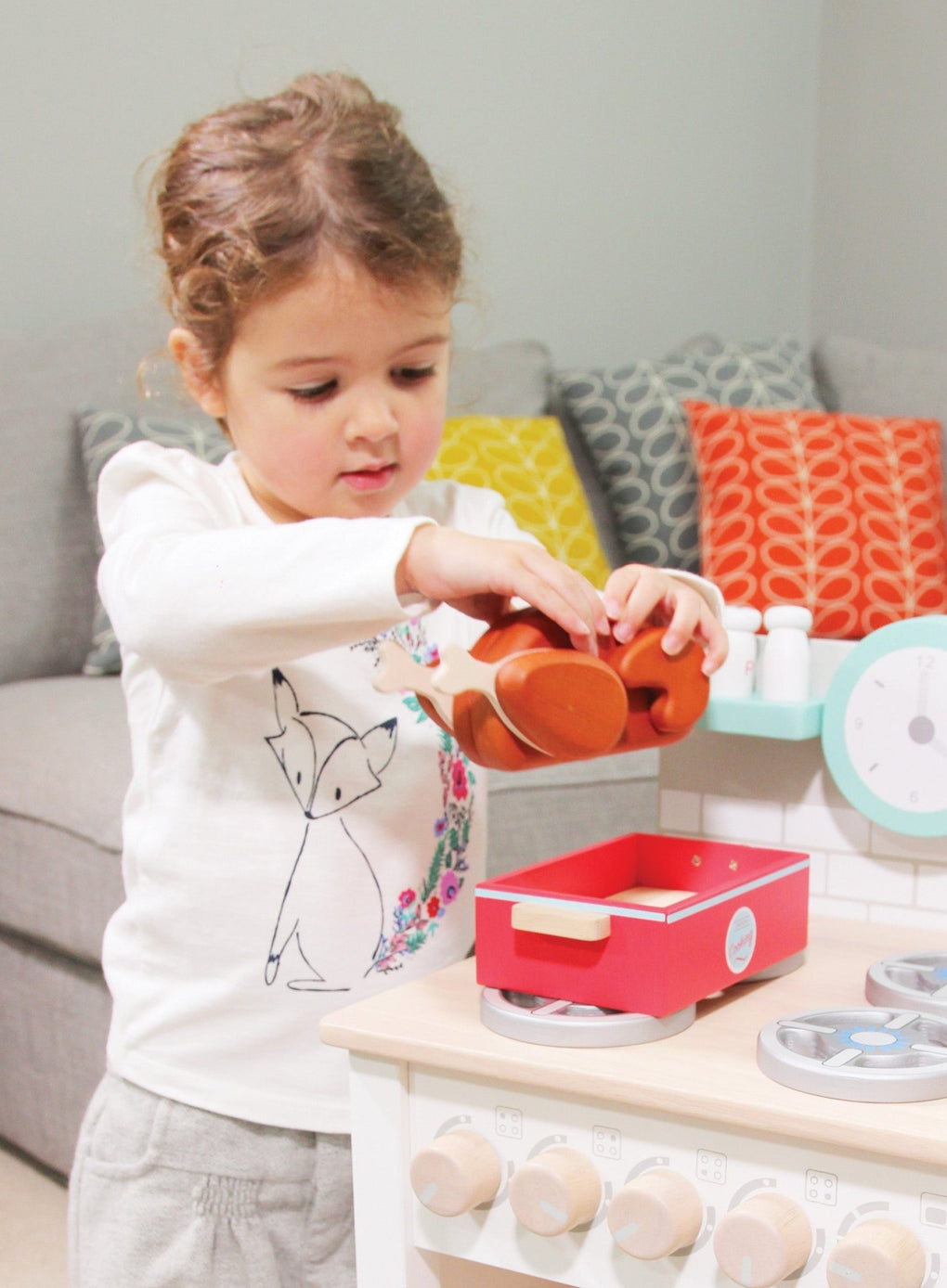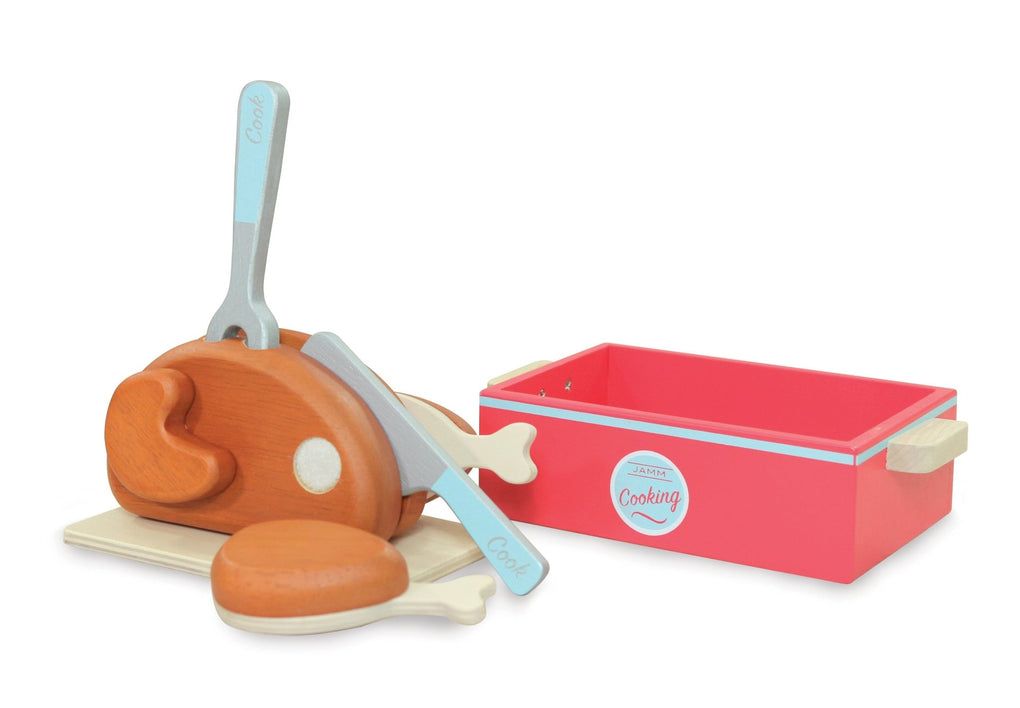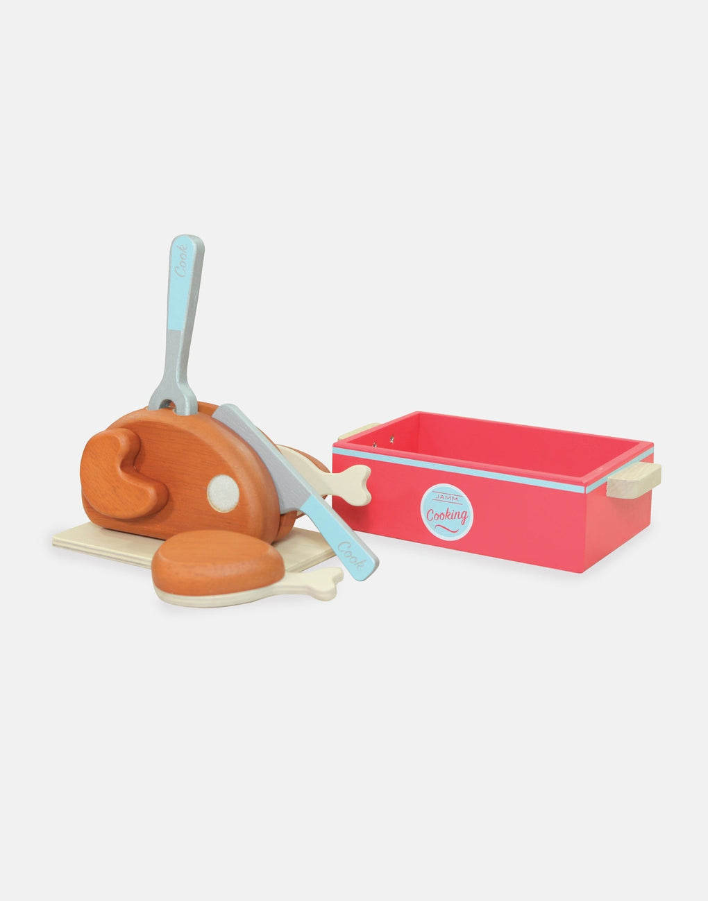 A solid rubber wood cutting velcro chicken. Slices into 6 parts and includes a carving set and baking tray with removable bottom that becomes a useful chopping board.