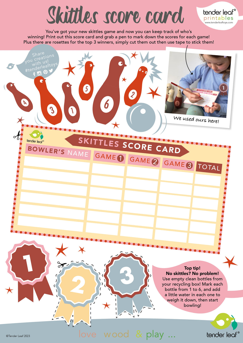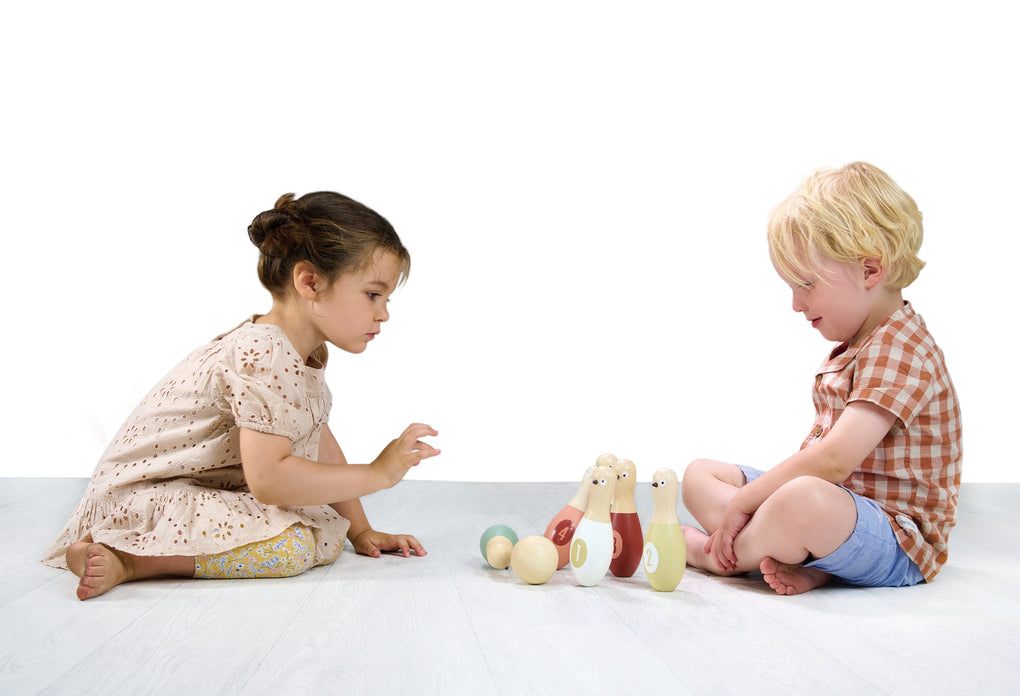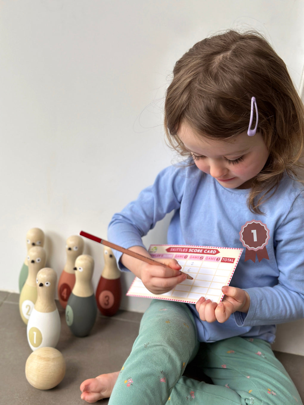 wooden bowling set comprising 6 skittles inspired by friendly pigeons and a solid wood ball. Different colours and numbers for competitive games. Comes with a fabric drawstring bag.