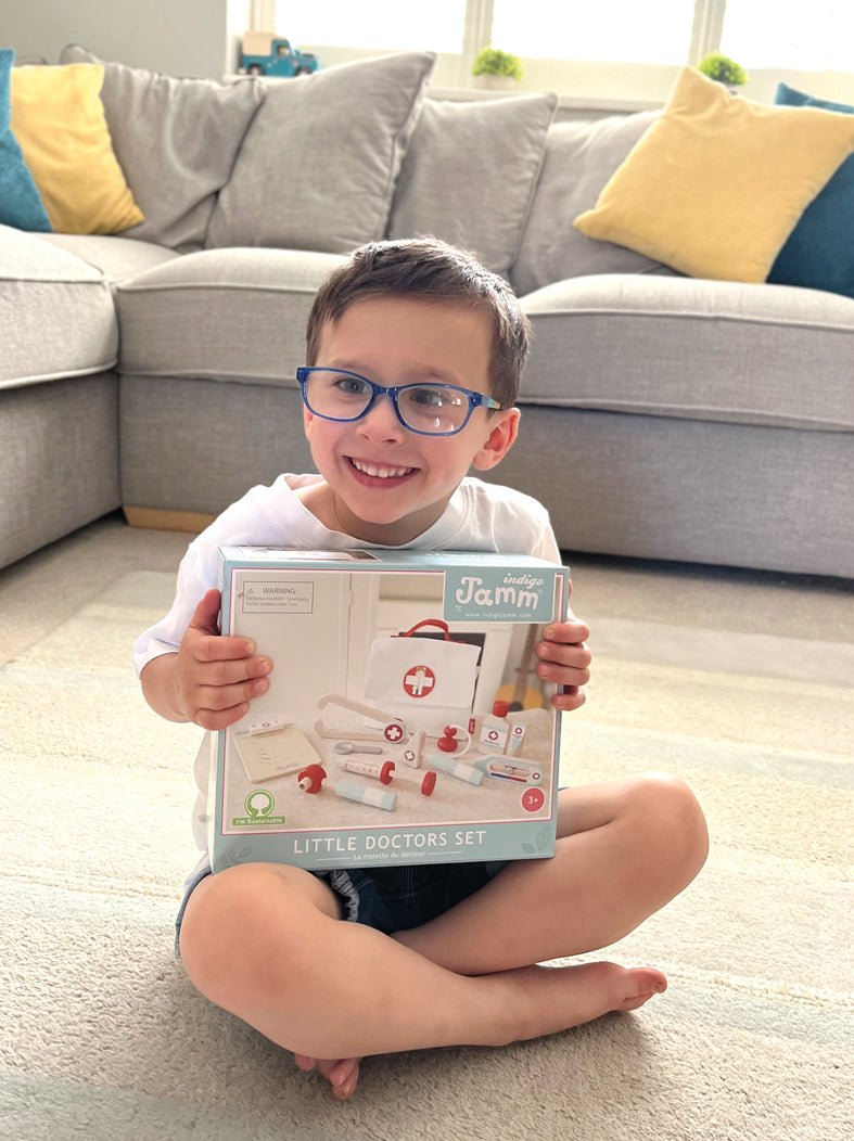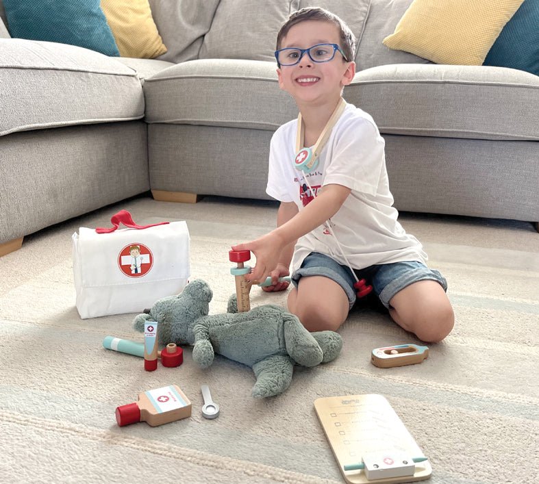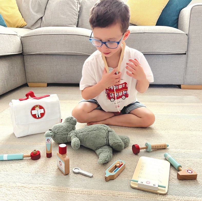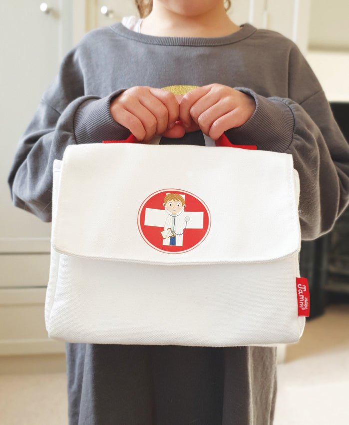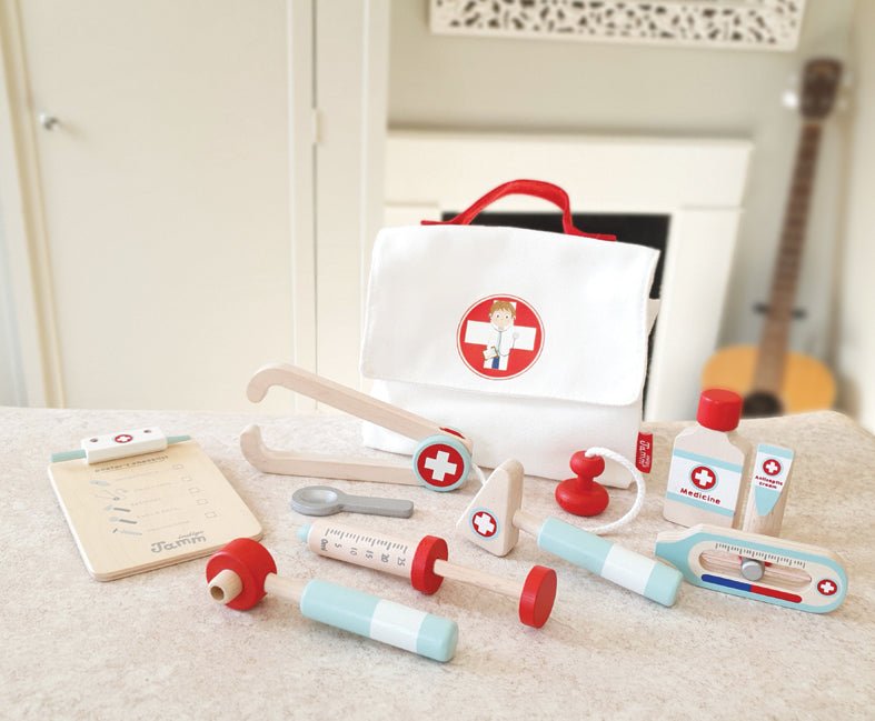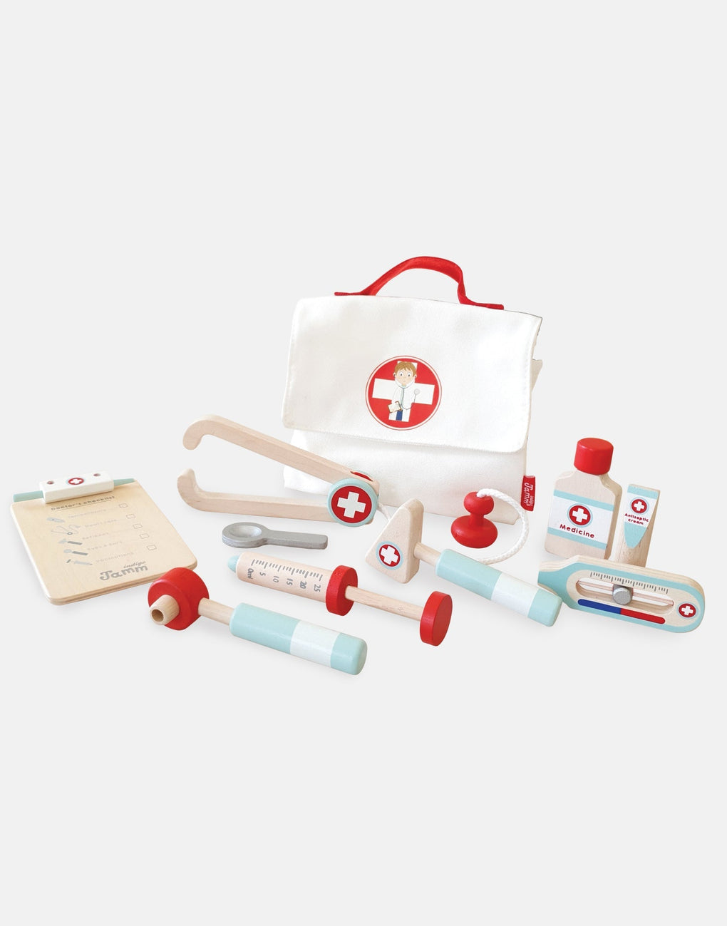A high-quality doctors set complete with elasticated stethoscope, thermometer with sliding temperature gauge, reflex hammer, ophthalmoscope, antiseptic cream, clipboard and pen, medicine and spoon. All packs away in the bag.