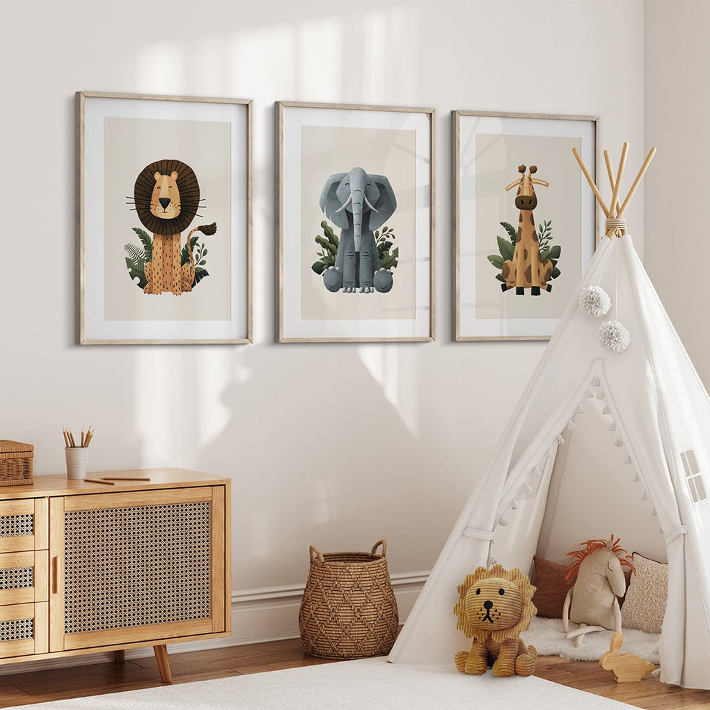 introducing our wonderful neutral safari theme lion, elephant and giraffe prints set – a delightful trio of beautifully illustrated, lovable characters that are sure to bring warmth and charm to any nursery, children's bedroom, or playroom.