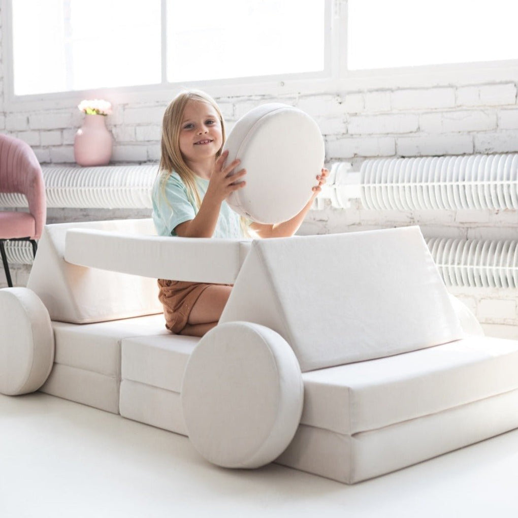 The modular sofa by Velinda is not just a functional piece of furniture. It is made up of 10 elements, which can be combined like building blocks to create various constructions according to your child's imagination: starting with various pieces of furniture (armchair, bed, pouffe, etc.), children can use them to build their own vehicles (car, rocket, excavator, etc.) and create imaginative constructions - after all, a child's imagination has no limits.