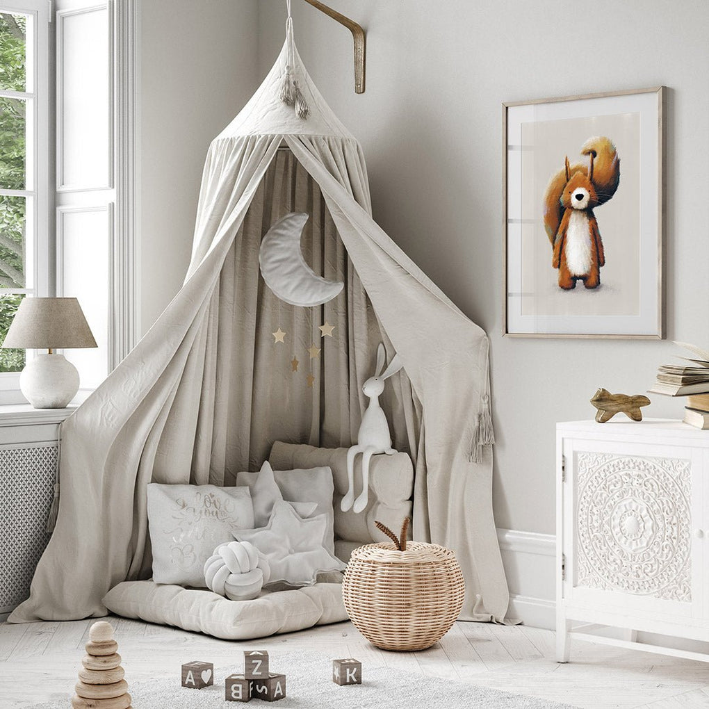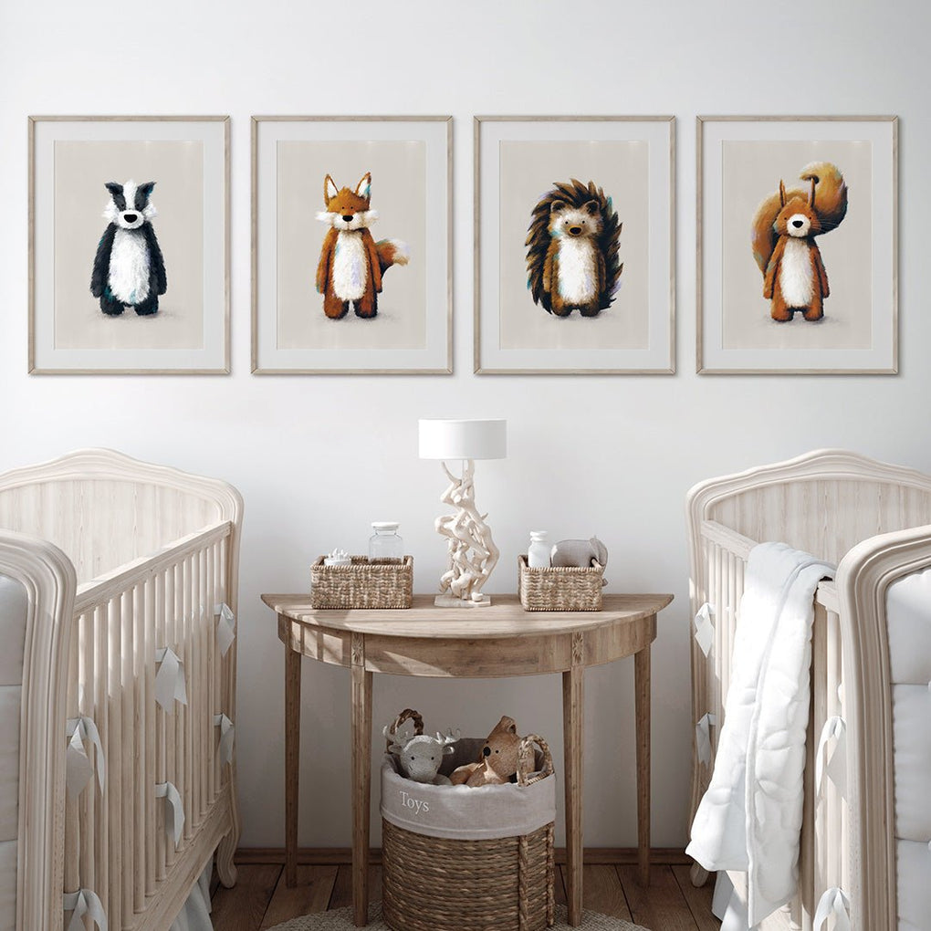 introducing our woodland animals collection, showcasing our charming fox, squirrel, hedgehog and badger prints. This delightful set of four forest pals will add a touch of enchantment to your child's nursery, bedroom, or play area.