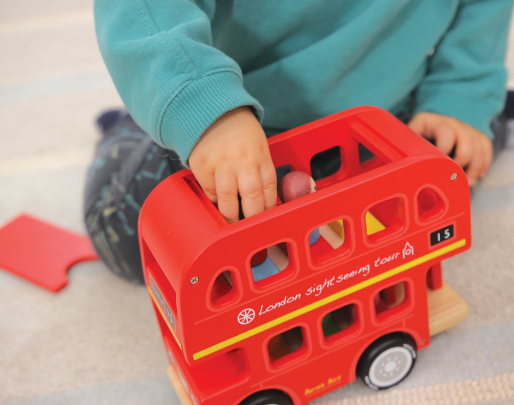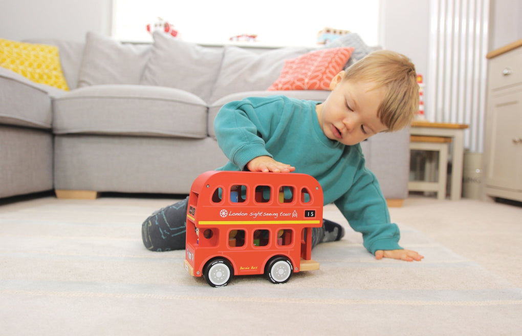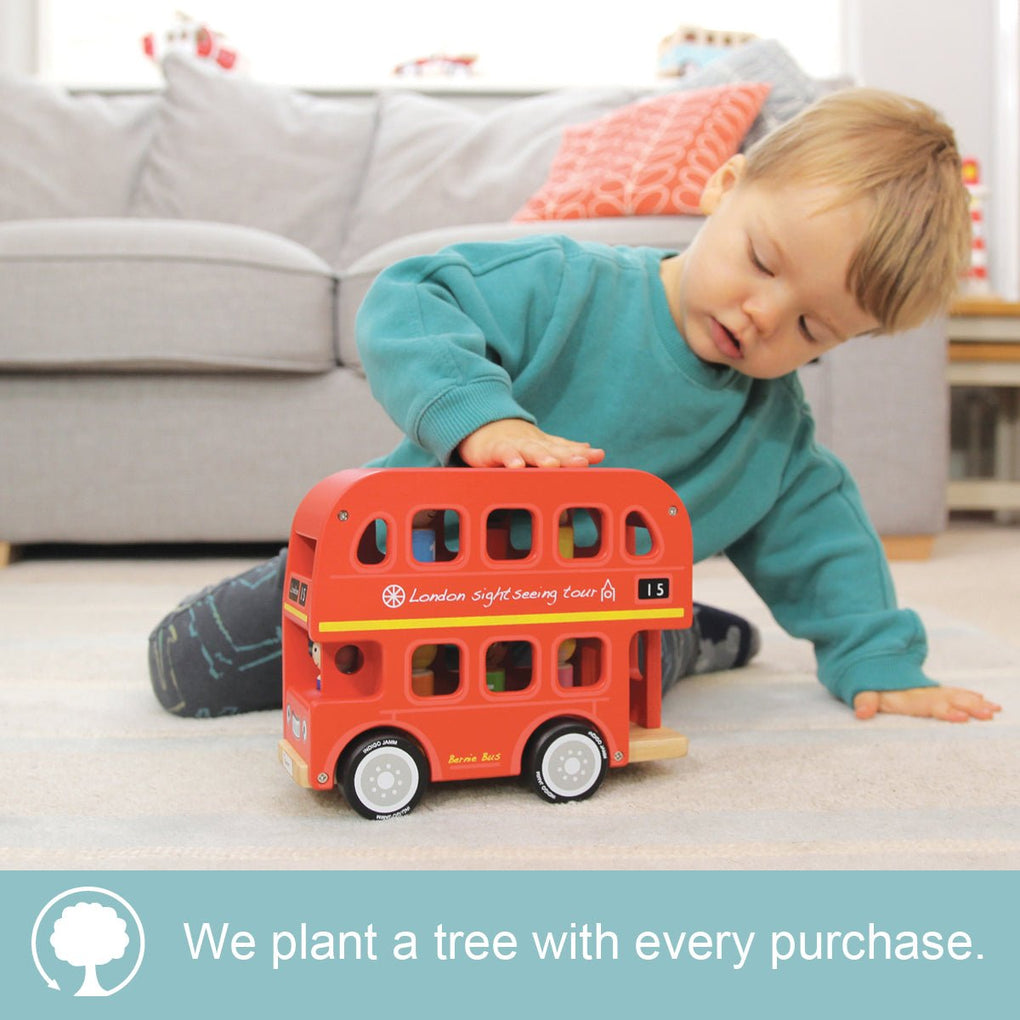 A wooden number-sorting London bus, perfect as an early years gift. Match the wooden peg passengers by colour or number to their seats in this durable London bus made from rubber wood. With removable roof and top floor to allow easy access for small hands. This fun traditional wooden toy helps to promote fine motor skills and hand-eye coordination. This wooden toy is made of sustainable rubber wood. Comes in an attractive full colour retail box.