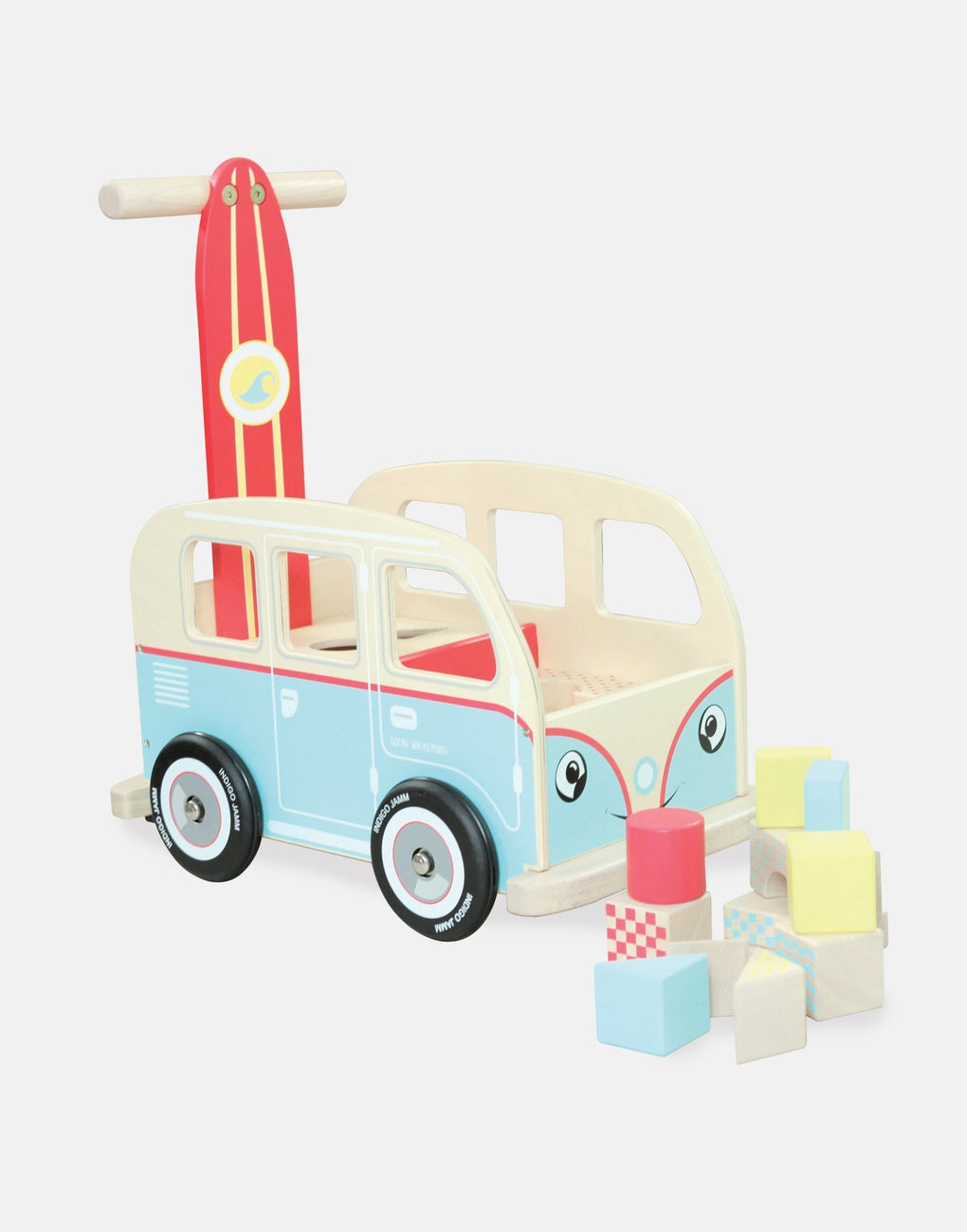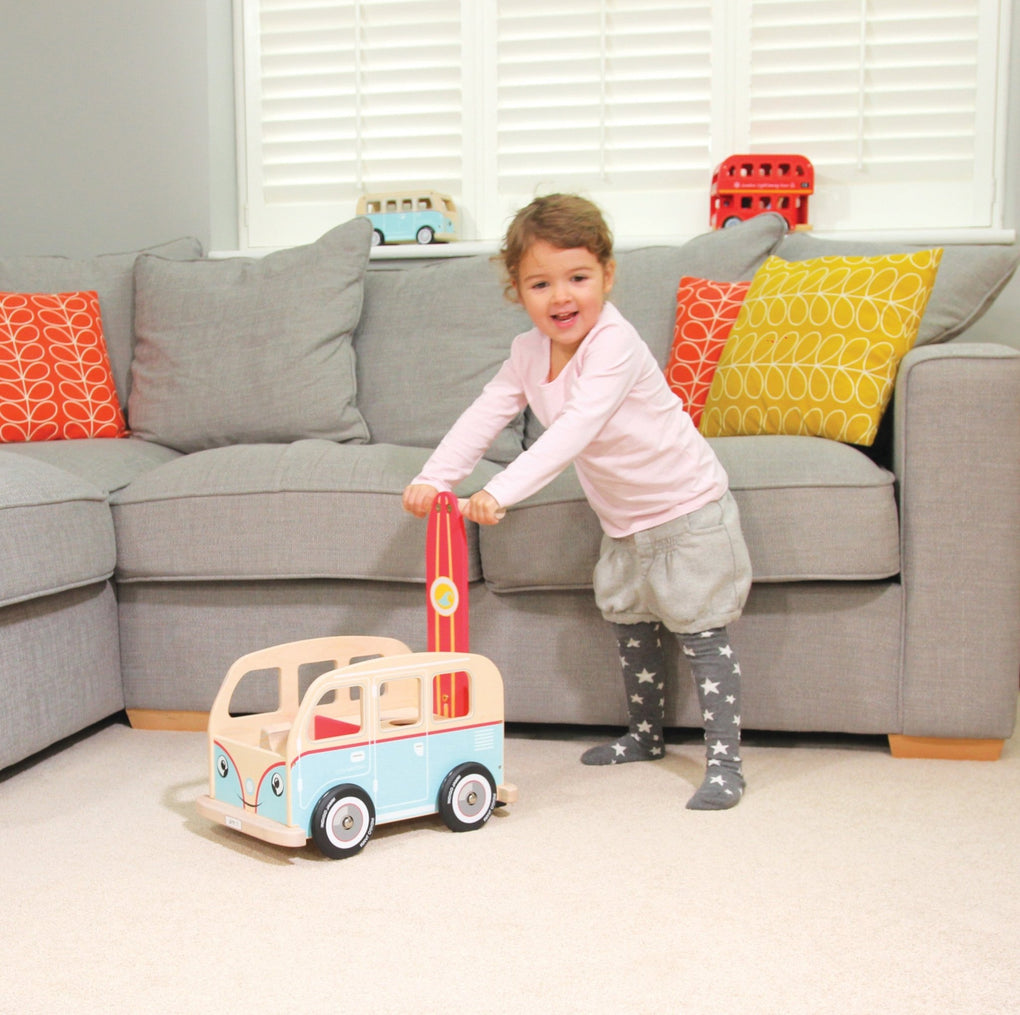 A retro camper van baby walker with chunky wheels and surfboard handle.