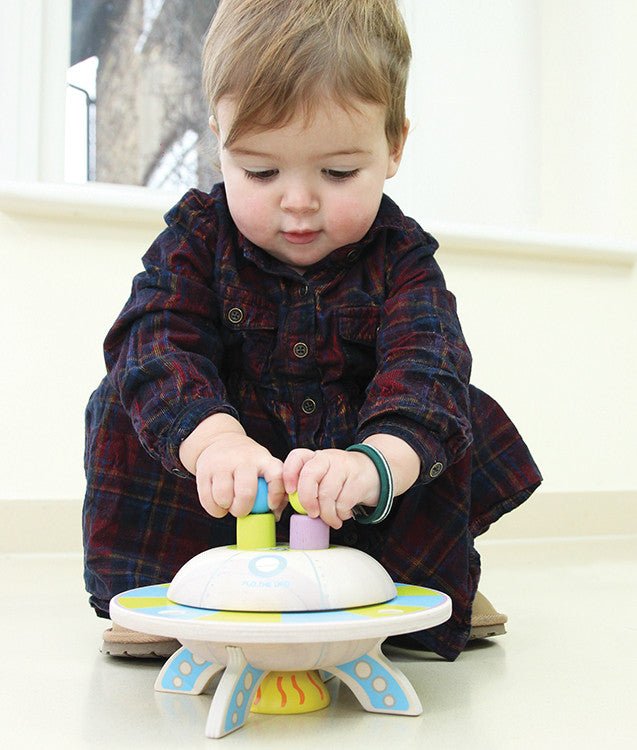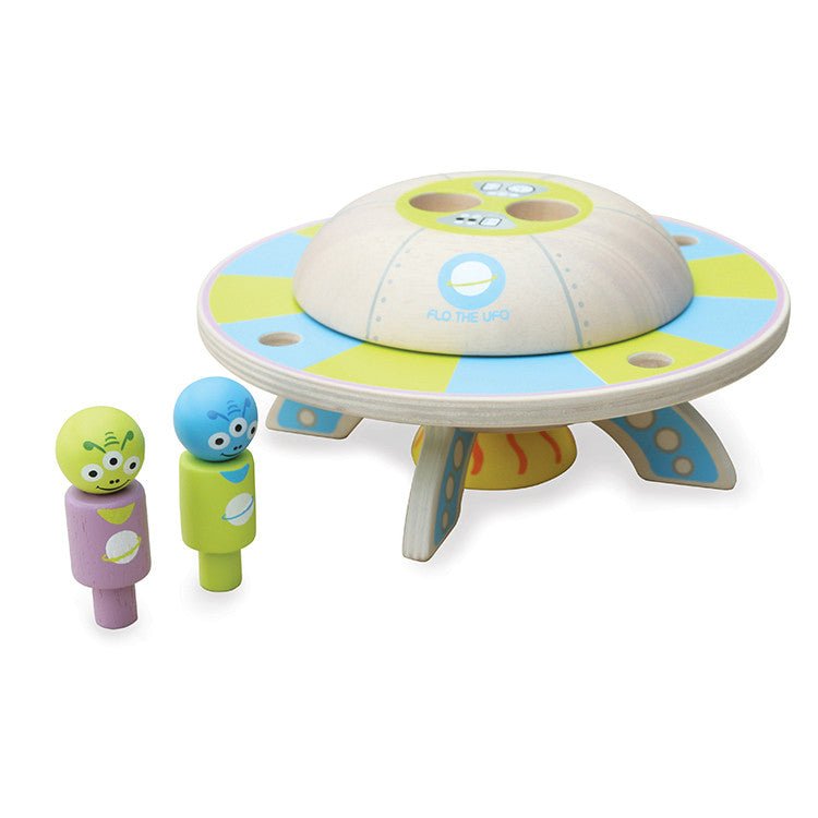 A very solid and chunky wooden toy ufo with spinning saucer. Complete with two colourful removable wooden aliens. this retro wooden toy is made of sustainable rubber wood and plywood.