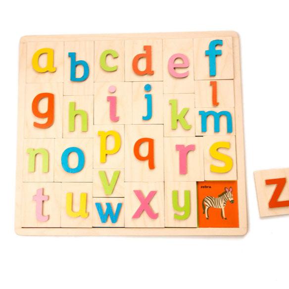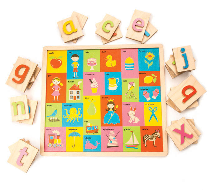 a large wooden tray puzzle made from beautiful quality plywood. 26 pieces with relief 3 dimensional letters, lift to reveal retro style illustrations of an object that starts with that particular letter.