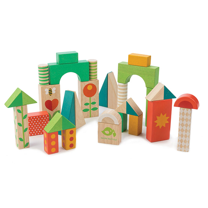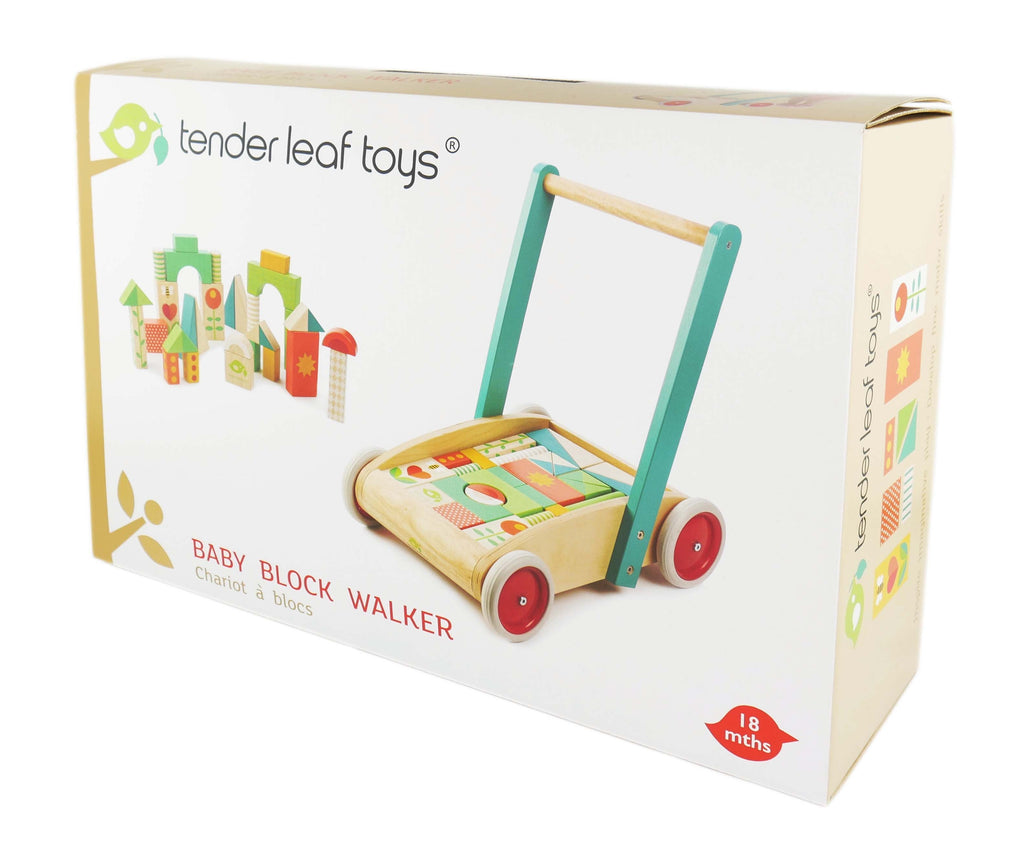 a sturdy wooden baby walker with large rubber wheels. Get creative with the 29 colourful wooden blocks and shapes and match them to the stencilled shapes.