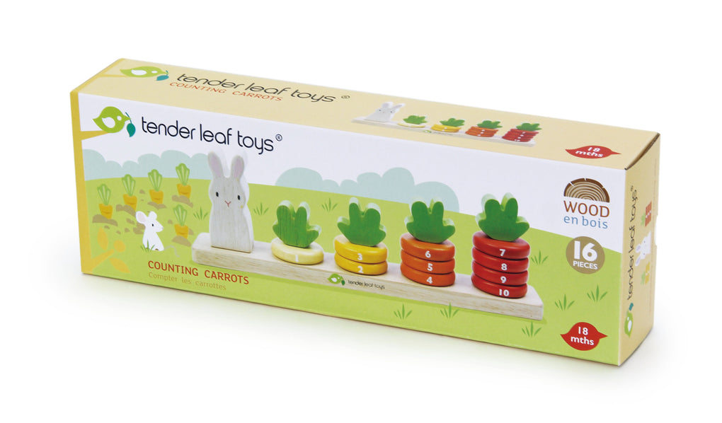 counting game that is a base with one rabbit, and 10 numbered rings to stack in order. Top them all off with a green leaf!