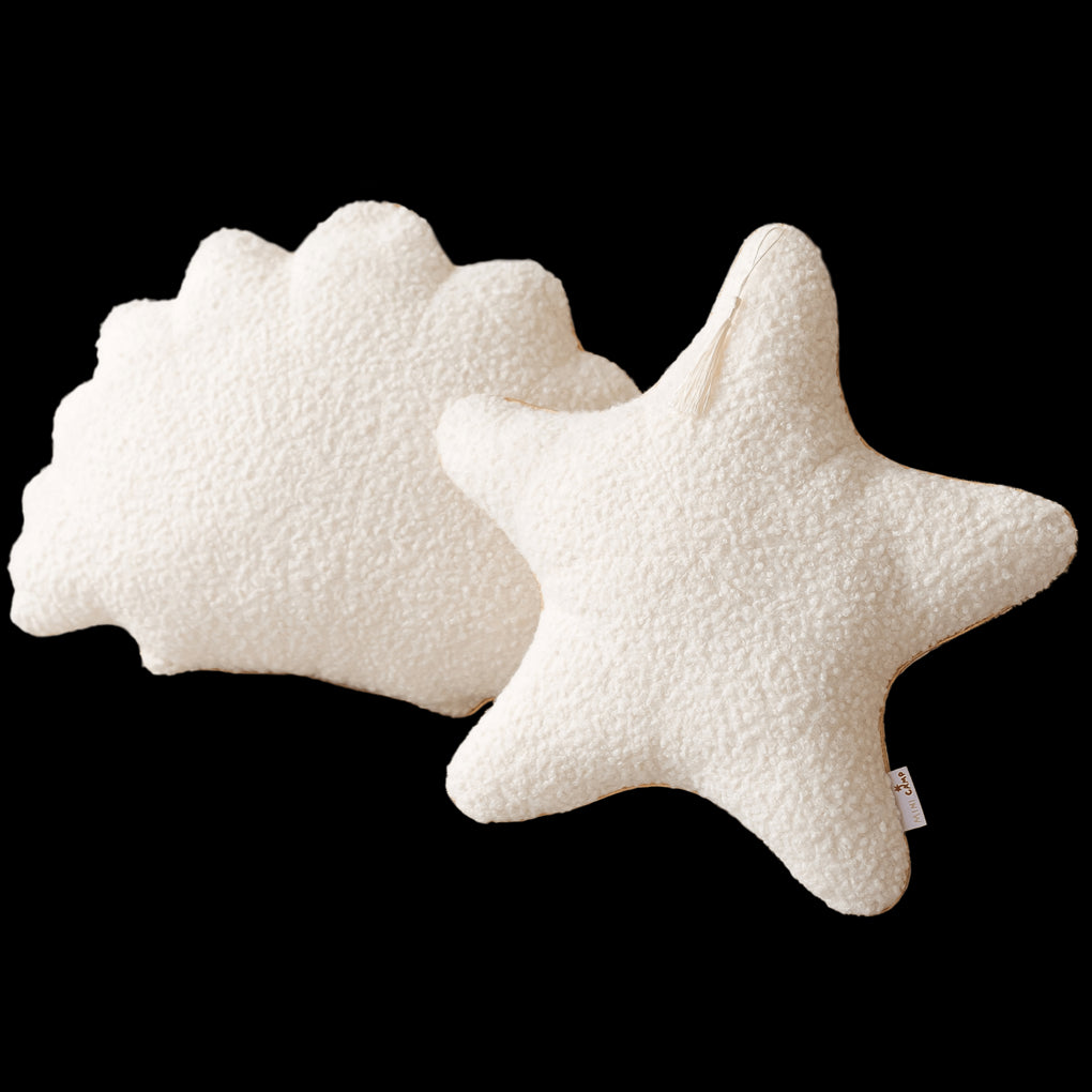 Made from 100% polyester boucle fabric, these soft and durable pillows feature the same texture on both sides. The set includes a seashell (45 x 38 cm) and a starfish (48 x 44 cm) cushion, filled with OEKO-TEX certified siliconized polyester fiber for comfort.
