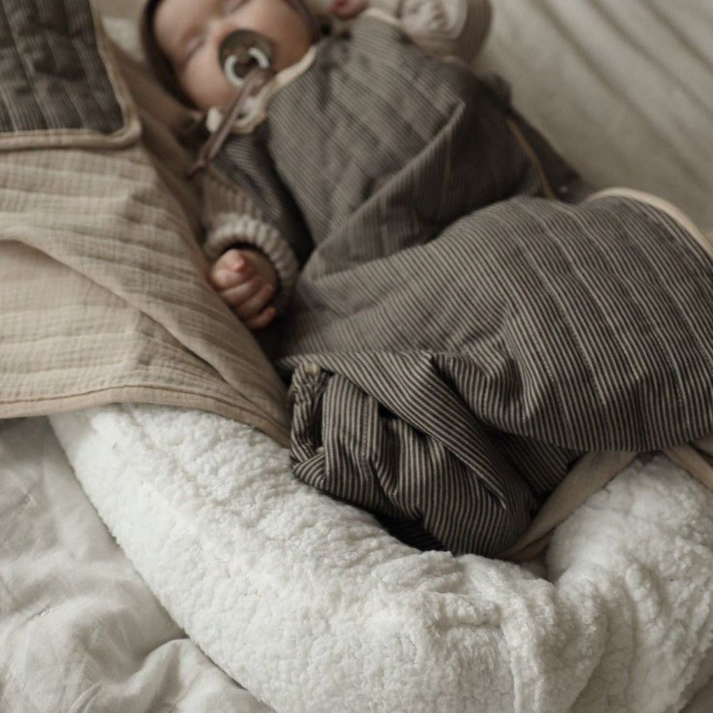 Never leave a child unattended lying at height (sofa, table, kitchen counter). The cocoon does not protect against falling. The cocoon should only be carried empty, it is not a carrier or a rocker. For safety reasons, the product should be used under the supervision of an adult. The drawstring should always be tied in a knot at the end; remember to always place the baby's head in the opposite direction to the strings, use the socket on a flat surface. The product should not be used in a bed while the child is sleeping without parental supervision.