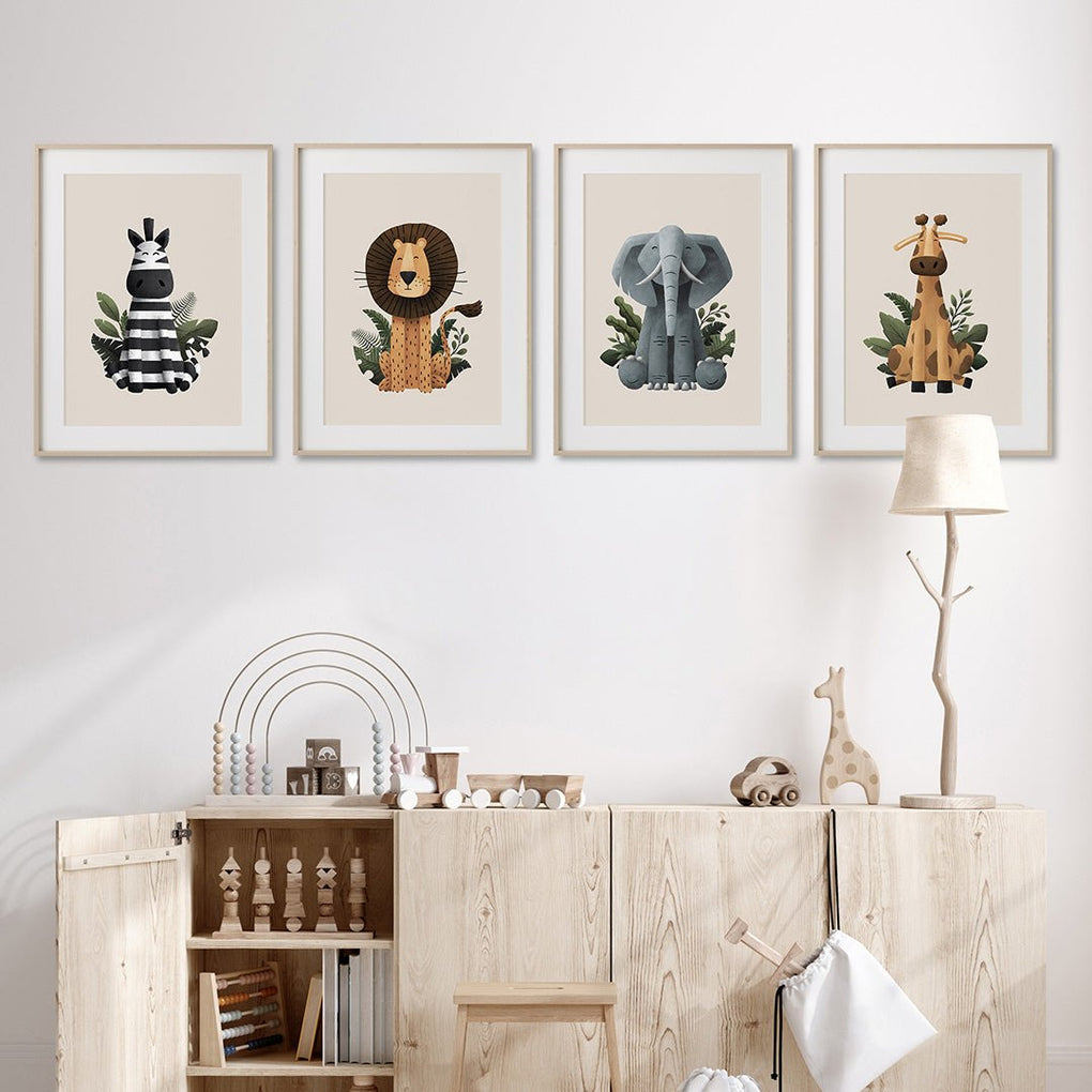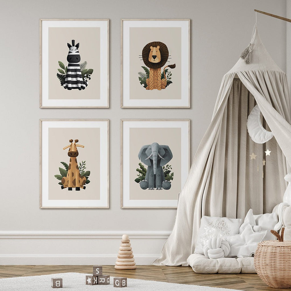 introducing our wonderful neutral safari theme lion, elephant, giraffe and zebra prints set – a delightful quartet of beautifully illustrated, lovable characters that are sure to bring warmth and charm to any nursery, children's bedroom, or playroom.