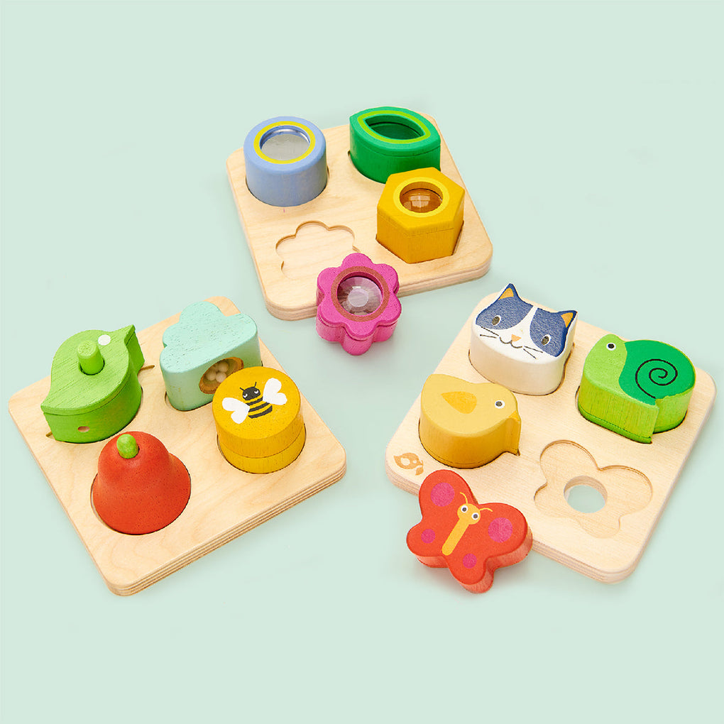 colourful solid wood shapes that allow you to see the world in a different way! Presented on a shape sorter plywood tray.