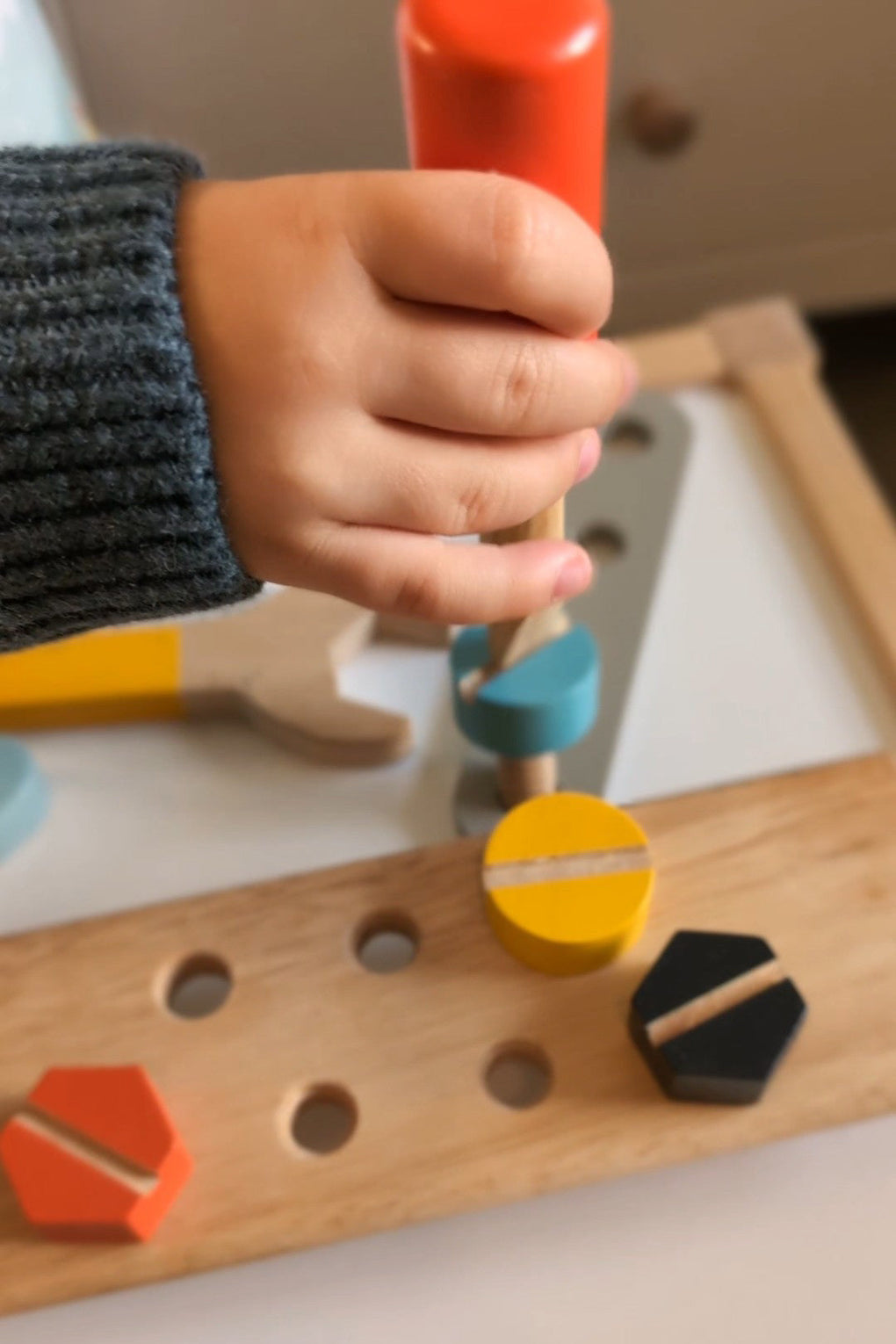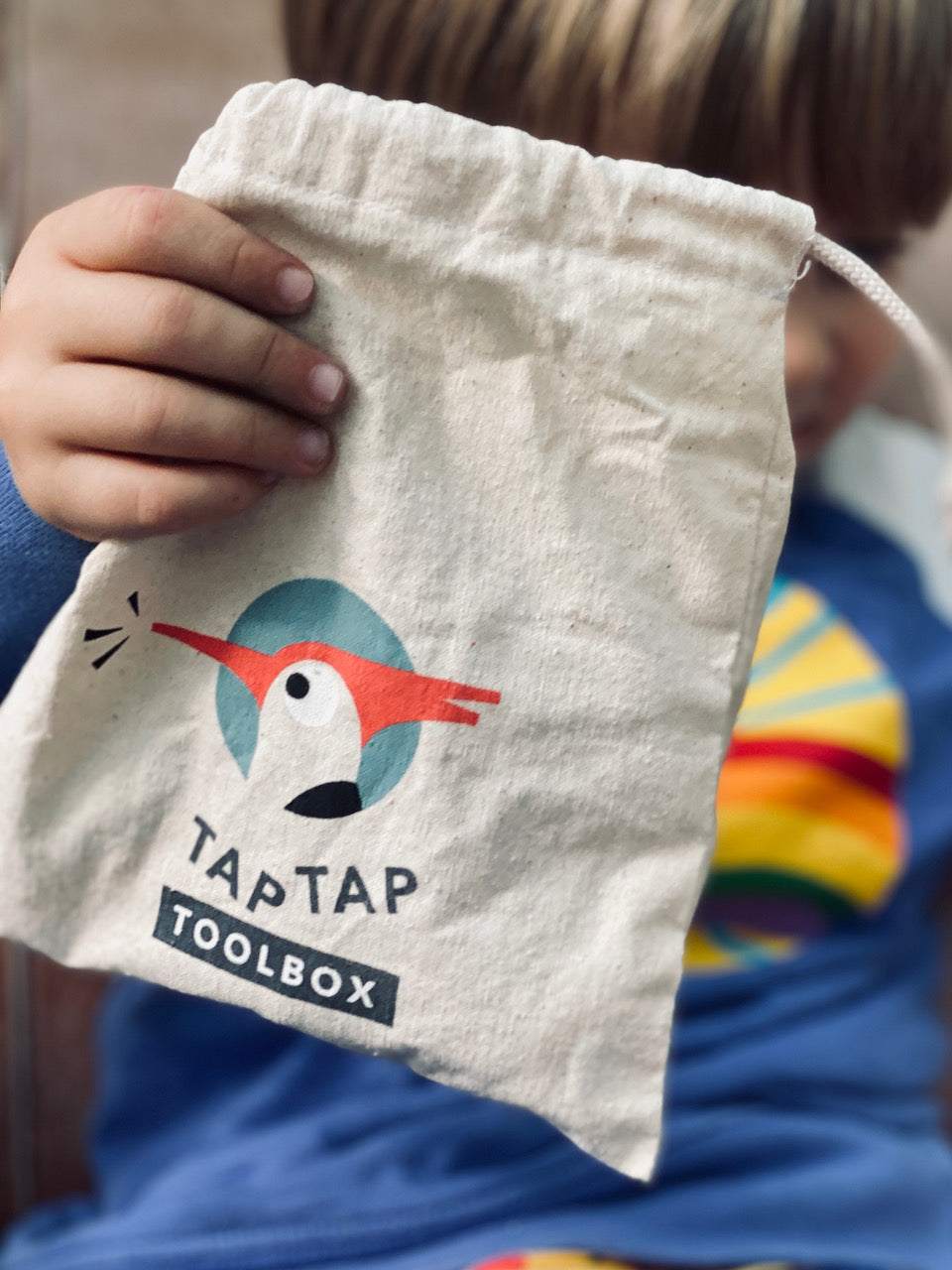 this is a wonderful addition to our ever-popular tool benches collection, a woodpecker themed tool box filled with everything you need to build something on your own. With two removeable lid pieces that turn into screwable plates, and a cloth printed bag to pack away after play, this set makes a great gift idea for any child who is a budding creative.